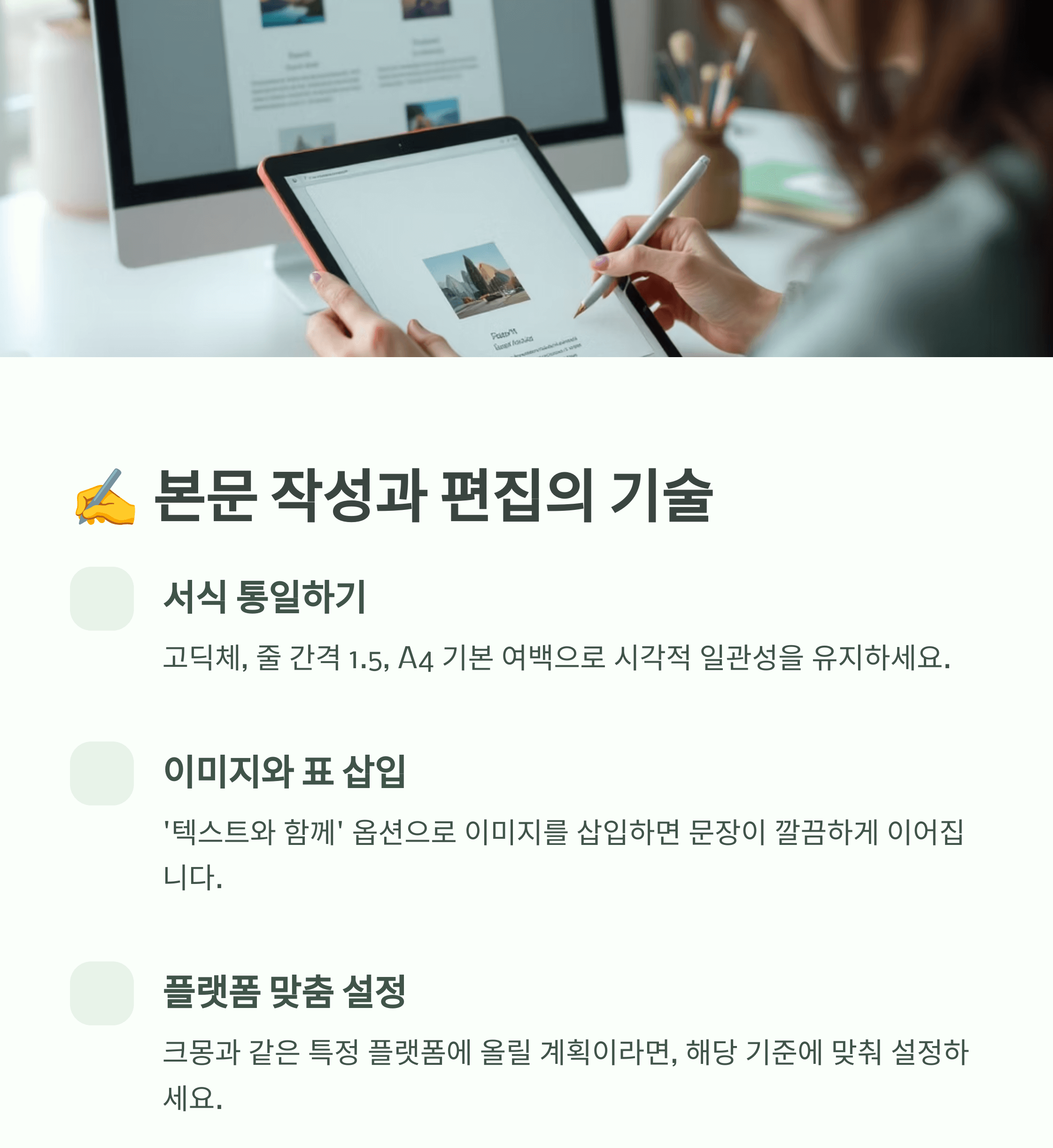 전자책은 시각적으로도 정돈되어 있어야 독자의 신뢰를 얻을 수 있어요. 구글 독스의 기본 서식을 활용해서 '제목' '소제목'과 본문을 체계적으로 정리했습니다. 글씨체는 '고딕'으로 통일하고, 줄 간격 1.5, 여백 설정은 A4기본으로 맞추었습니다.