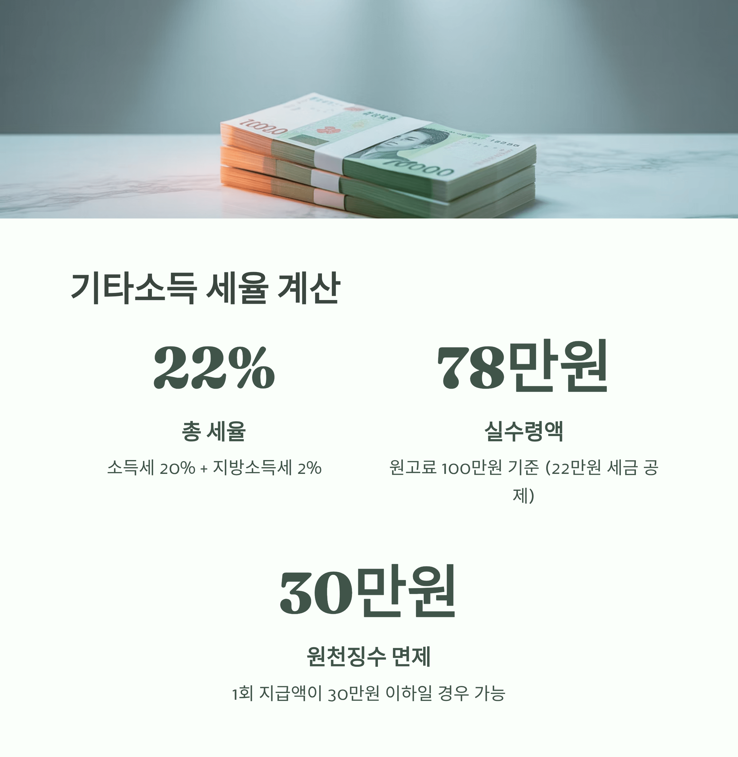 - 기타소득은 22% 세율로 원천징수되며, 연 300만 원 이하일 경우 분리과세로 세금 납부가 끝납니다.
