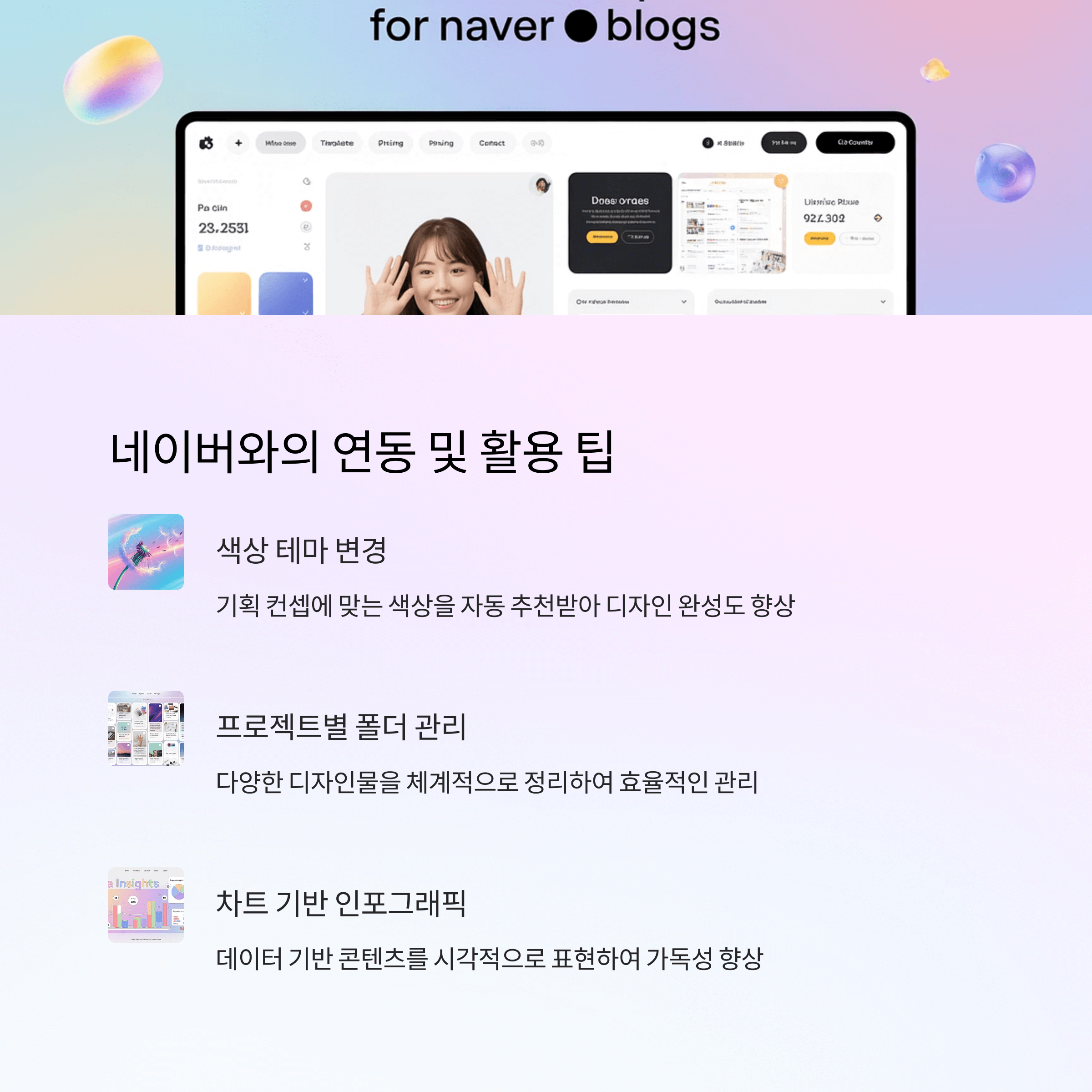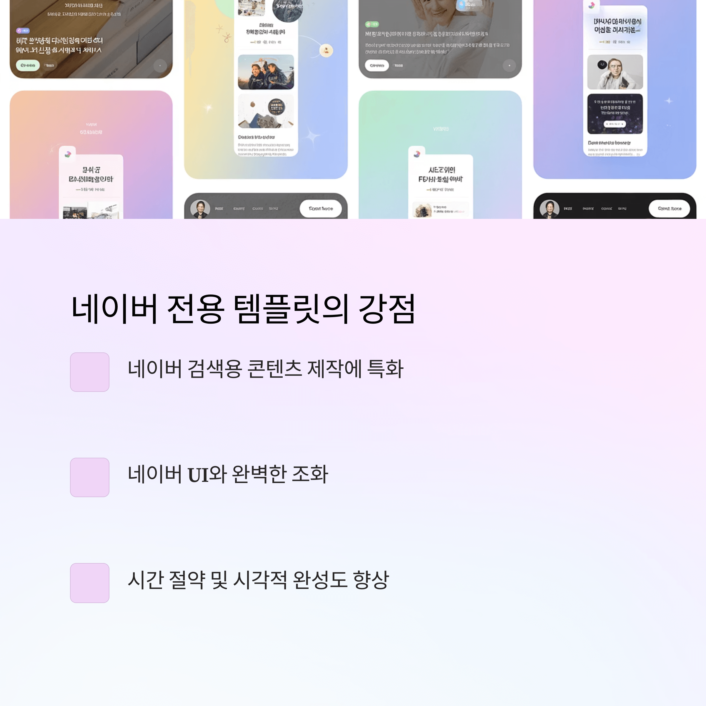 특히 네이버 검색용 콘텐츠 제작에 특화된 템플릿(블로그 배경, 후기 상세페이지, 네이버 프로필, 검색 썸네일 등)을 제공하는 것이 네이버 사용자에게 강점입니다 .