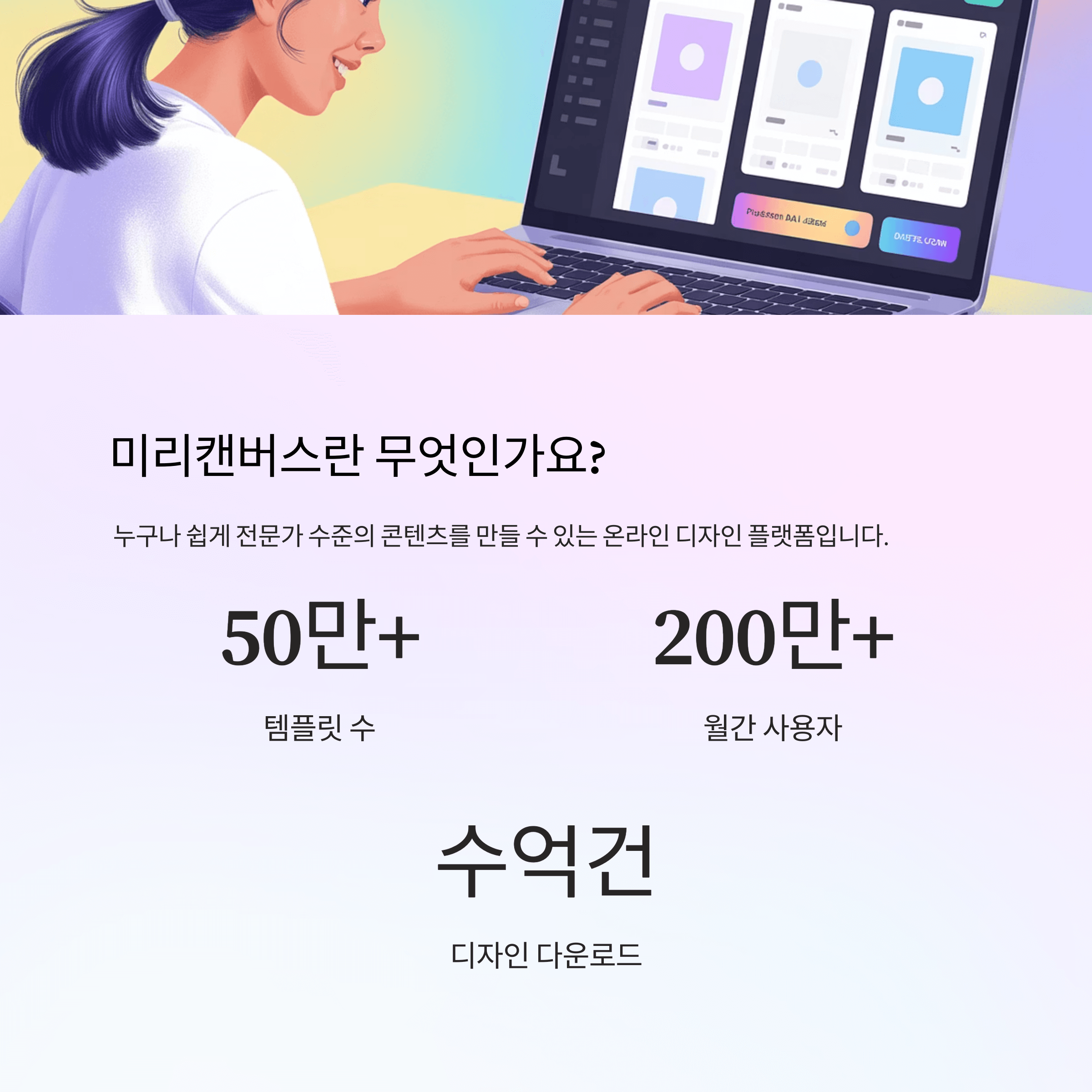 미리캔버스는 포토샵이나 일러스트처럼 복잡한 도구 없이도 누구나 쉽게 전문가 수준의 디자인 콘텐츠를 제작할 수 있는 온라인 디자인 플랫폼이에요.