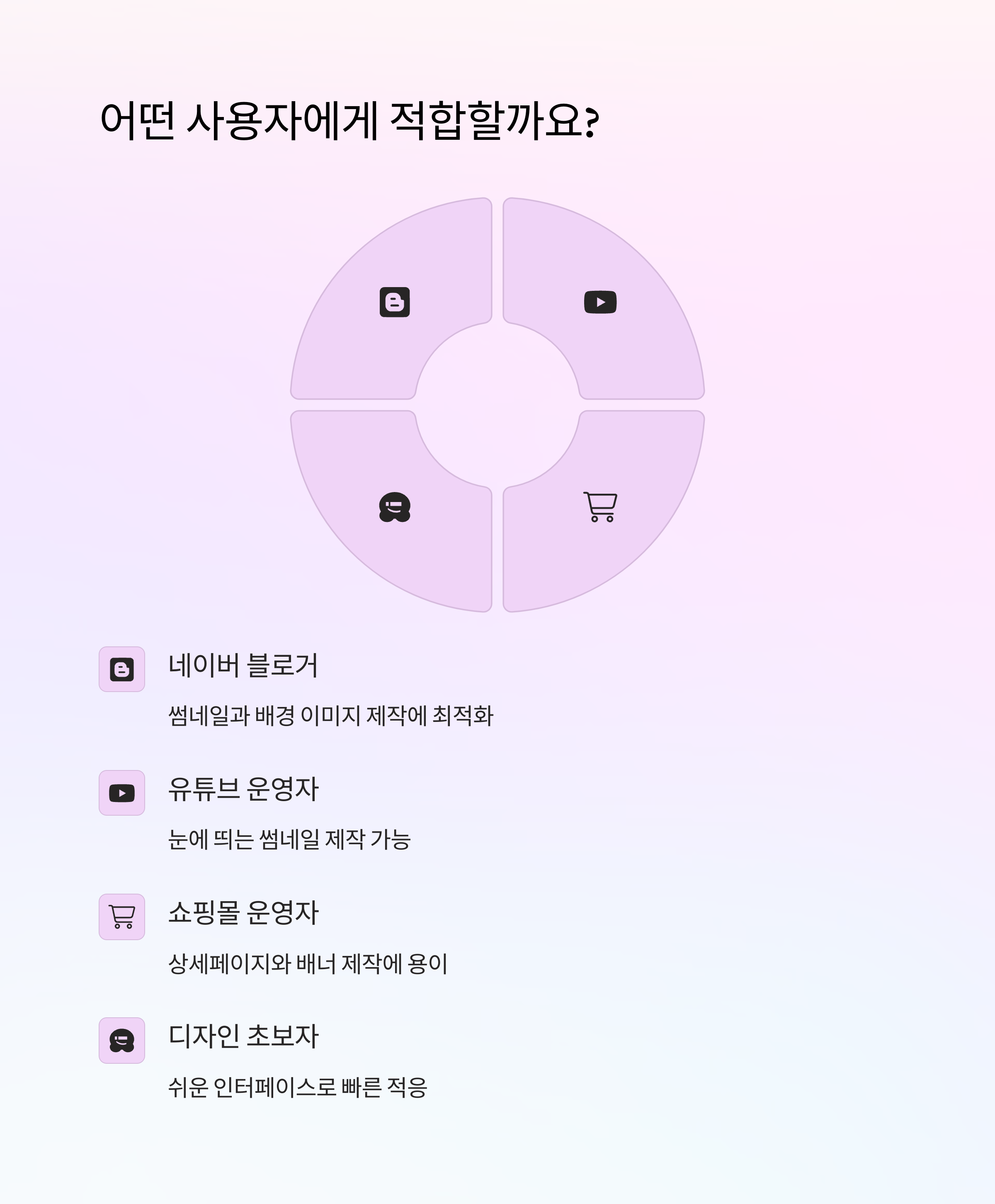 - 네이버 블로거, 유튜브 콘텐츠 운영자, 쇼핑몰 운영자 등 디자인 감각은 없지만 비주얼 콘텐츠를 제작해야 하는 분께 적합합니다.