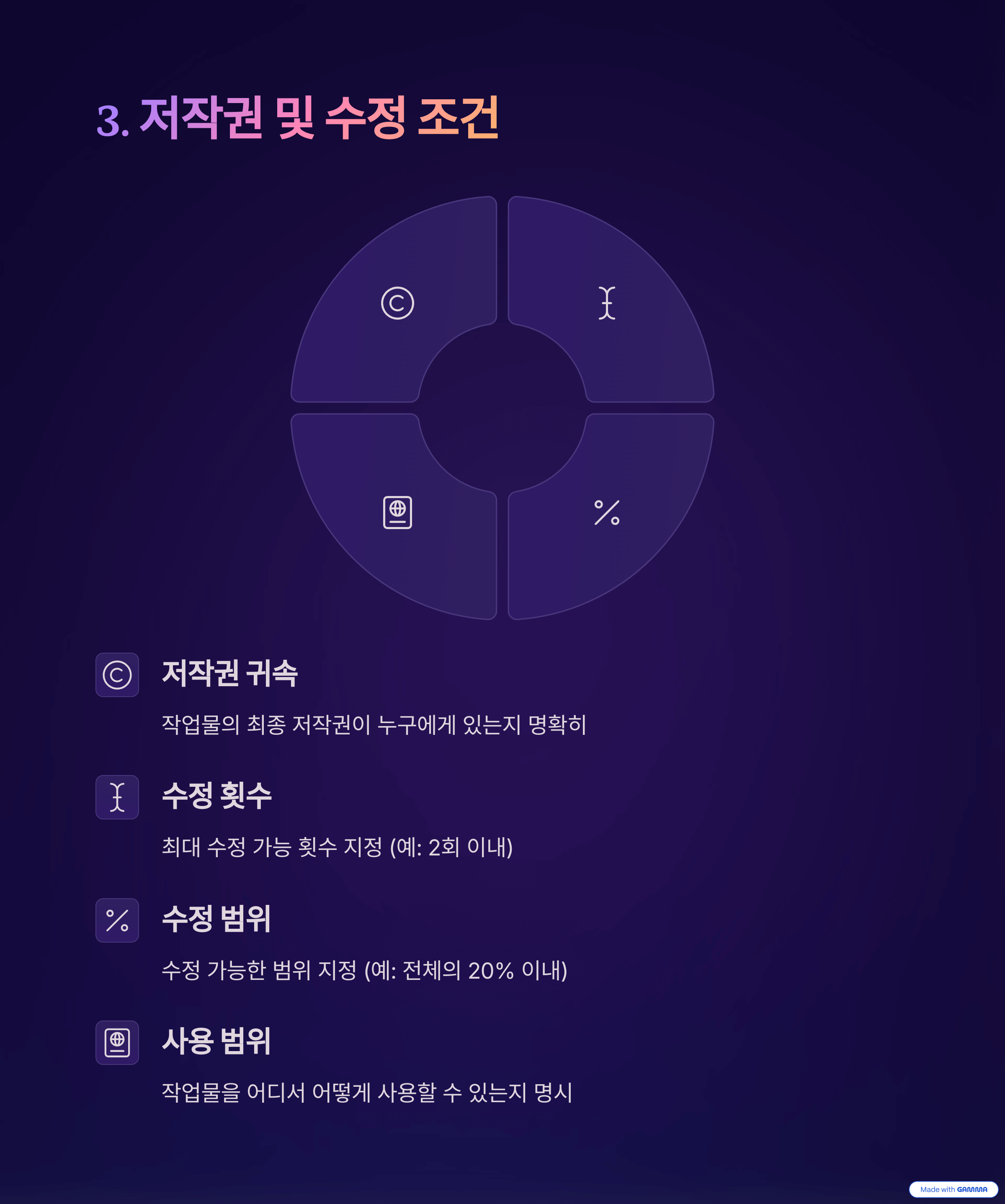 저와 같이 디자인, 콘텐츠 등 창작물이 포함된 작업물이라면 반드시 '저작권'문제도 생각해야 합니다. 또 수정은 몇 번까지 가능한지, 범위는 어디까지인지도 명시해야 합니다. 이를 놓치게 되면 무제한 수정 요청이나 무단 재사용 등으로 스트레스를 받게 됩니다.