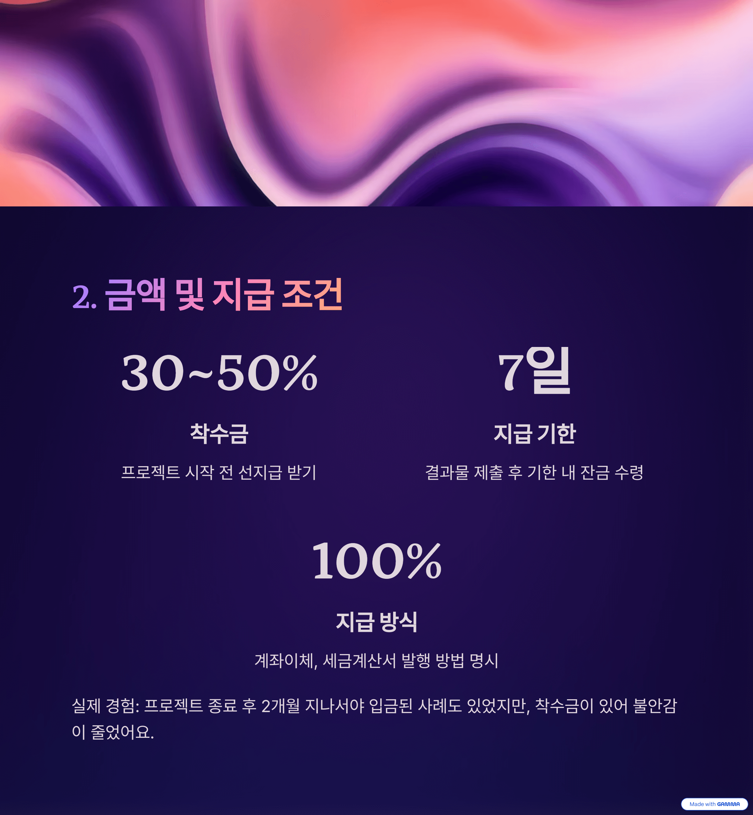 실제로 어떤 기업에서는 프로젝트가 끝난 후 2개월이 지나서야 입금을 해줬는데 미리 착수금을 받았기 때문에 어느 정도 불안을 덜 수 있었어요.