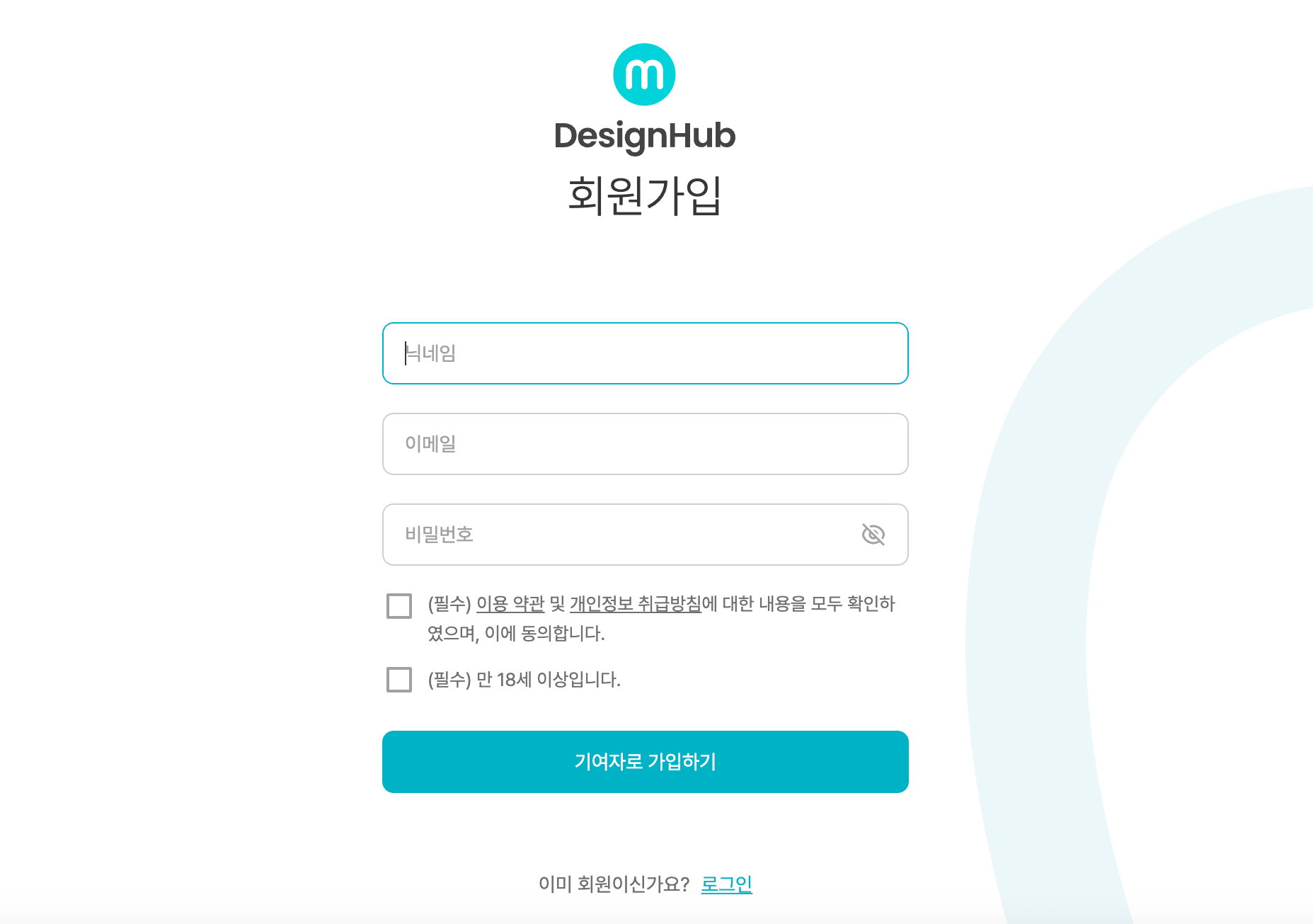 - 가입 폼 작성: 닉네임·이메일·비밀번호 입력 후 '기여자로 가입하기' 누르기