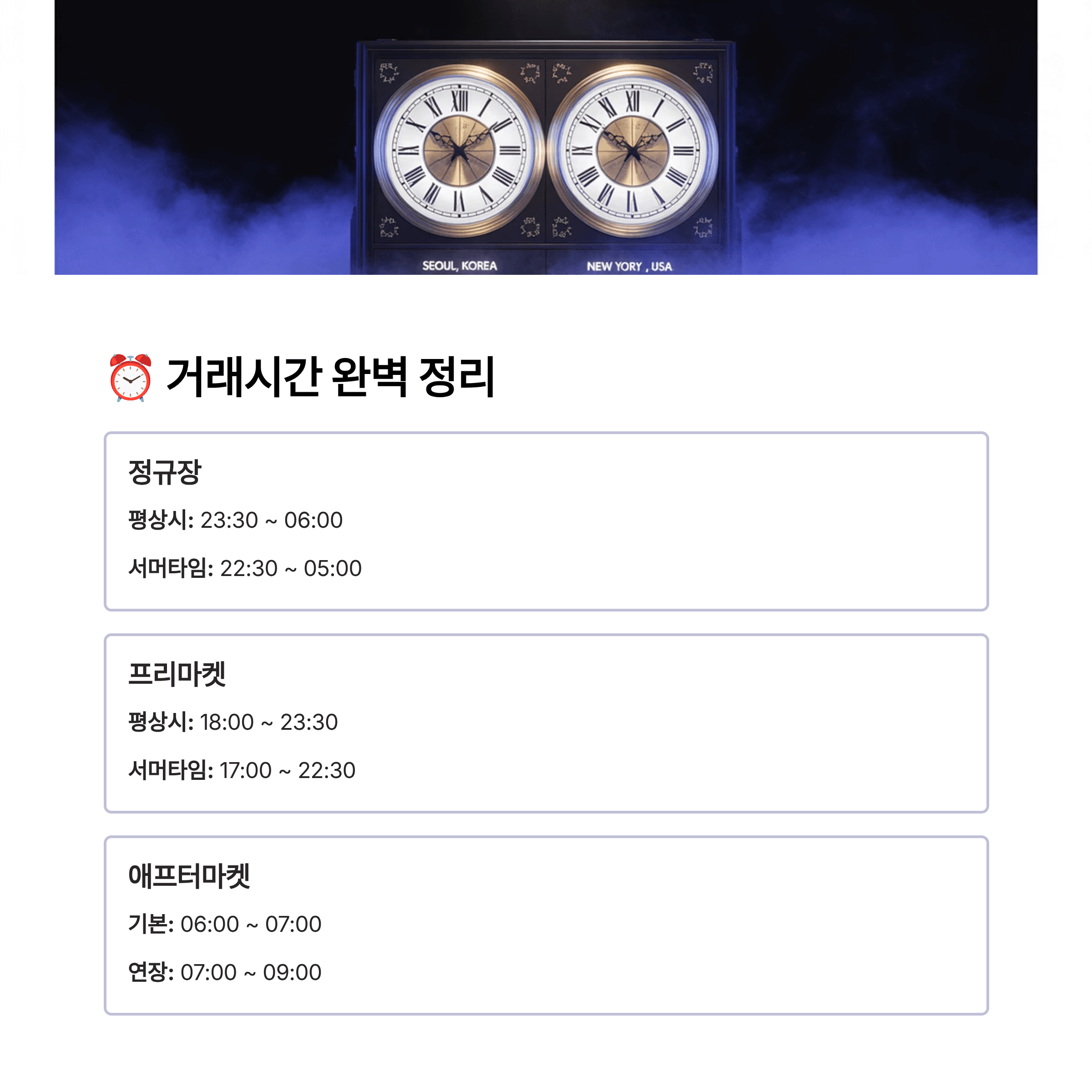 - 미국 주식은 정규장, 프리마켓, 애프터마켓 등 거래 시간이 다양하며 서머타임에 따라 변동됩니다.