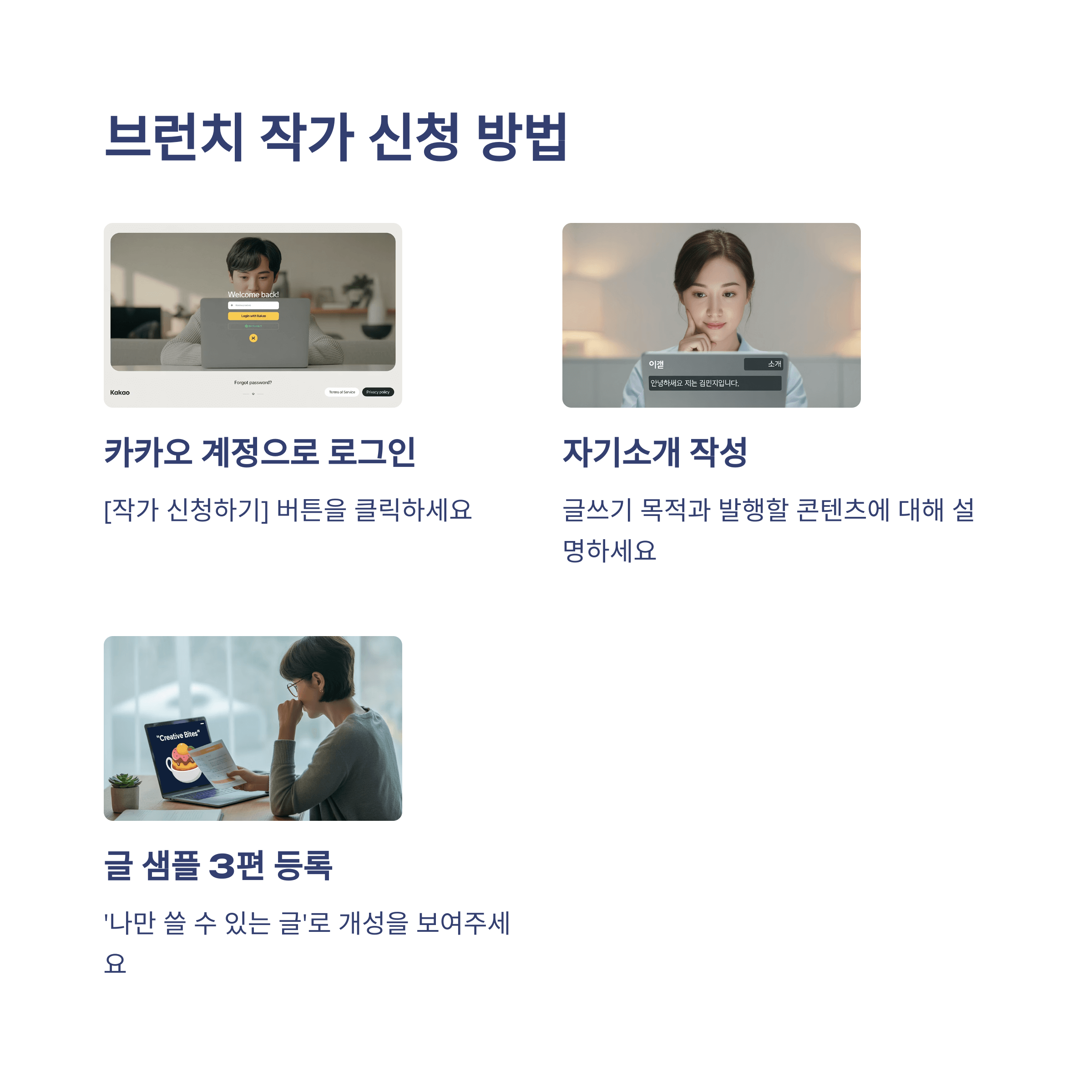 작가 신청은 카카오 계정으로 브런치에 접속한 뒤, [작가 신청하기] 버튼을 클릭하면 신청할 수 있습니다.