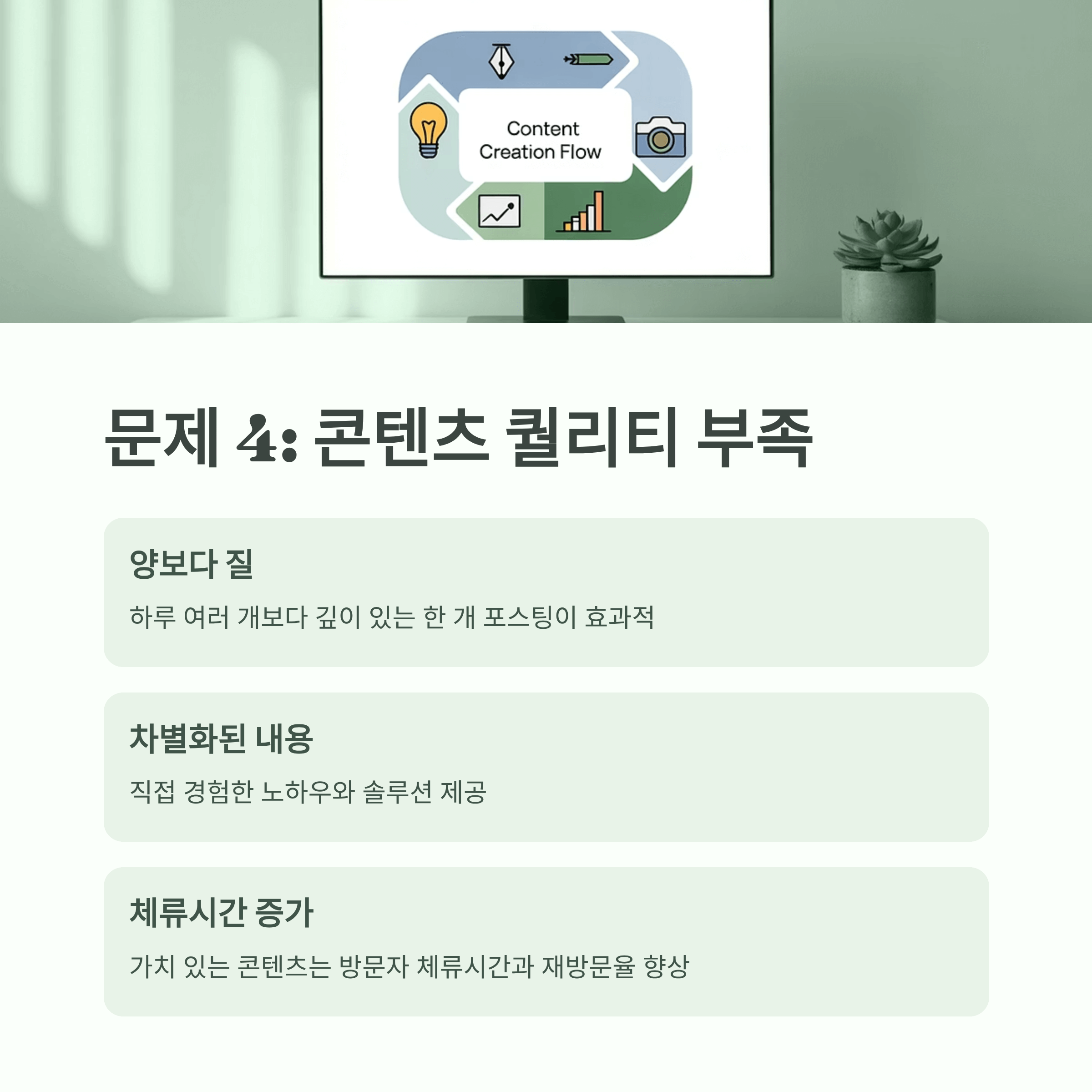 확실히 수익형 블로그는 글을 자주 쓰는 것만으로는 수익이 나지 않습니다. 예전에는 하루에 3~4개의 포스팅을 하면서 양으로 승부를 보려고 했습니다. 그러나 방문자는 오히려 줄어들었고, 구독자도 이탈했습니다. 이유는 간단했습니다. 글의 내용이 얕고, 다른 블로그와 차별점이 없었기 때문입니다.