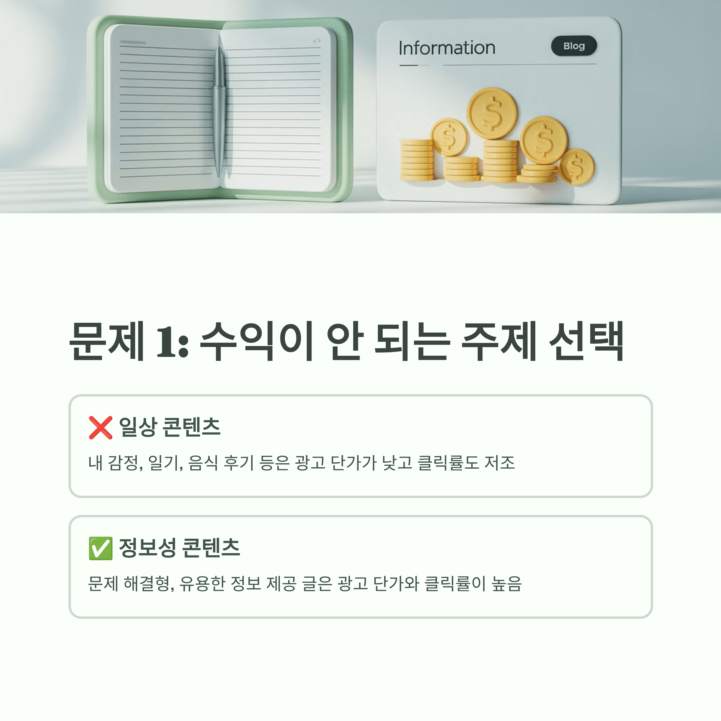 처음 블로그를 시작했을 때 저는 ‘일상'이야기로 적었습니다. 그날 먹은 음식, 그날 간 곳, 느낀 감정 등을 꾸준히 포스팅했죠. 분명 정성스럽게 썼고, 조회수는 꽤 많이 늘었고, 소통도 많이 했습니다. 그러나 수익은 전혀 발생하지 않았죠.
