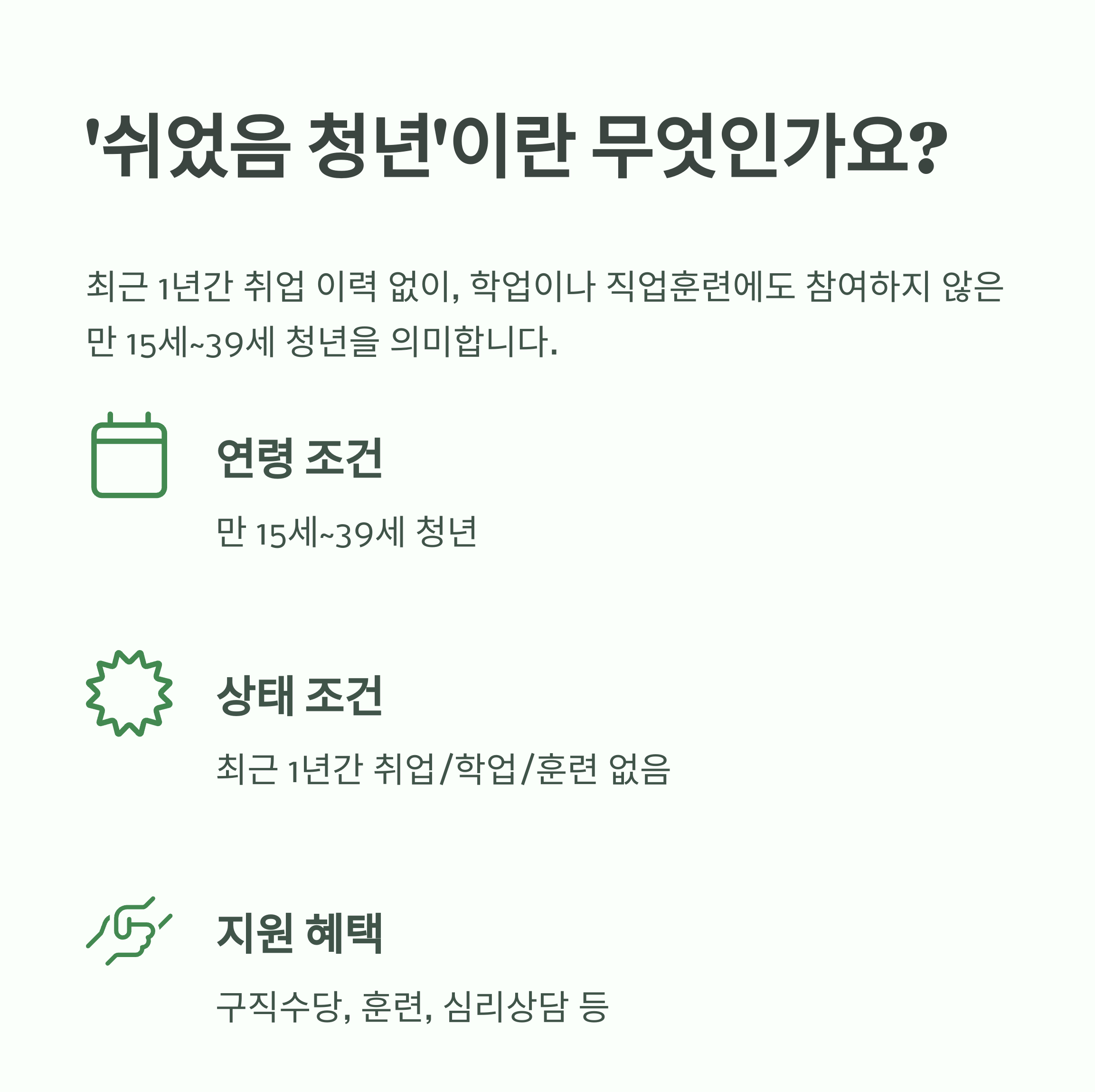 정부 정의에 따르면, 최근 1년간 취업한 이력 없이, 학업이나 직업훈련에도 참여하지 않은 상태인 만 15세~39세 청년을 “쉬었음 청년”이라고 합니다