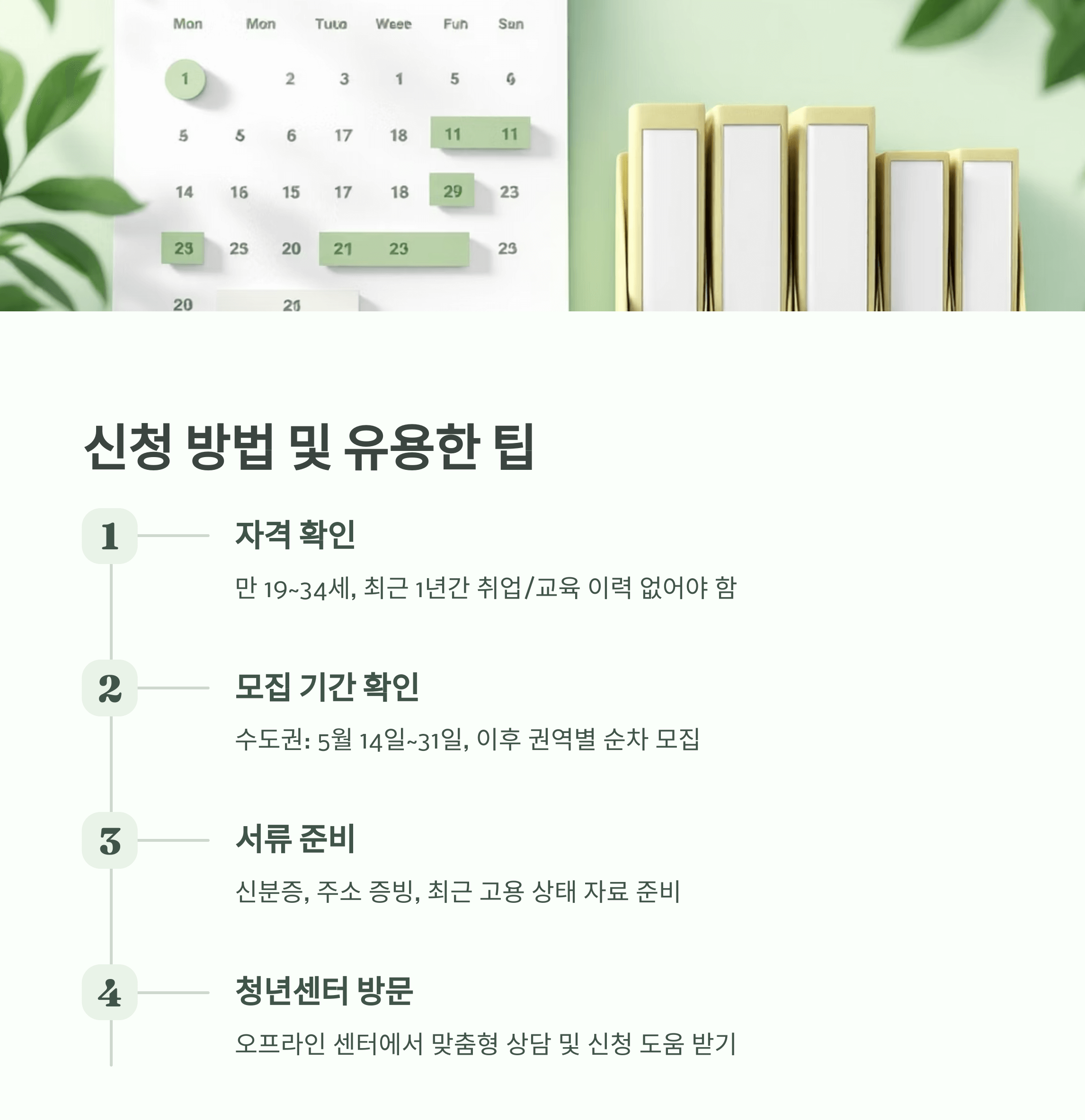 (4) 청년센터 방문 상담 추천: 오프라인 센터에서 맞춤형 상담, 신청 도움, 추가 연계 프로그램 안내를 받을 수 있어요.