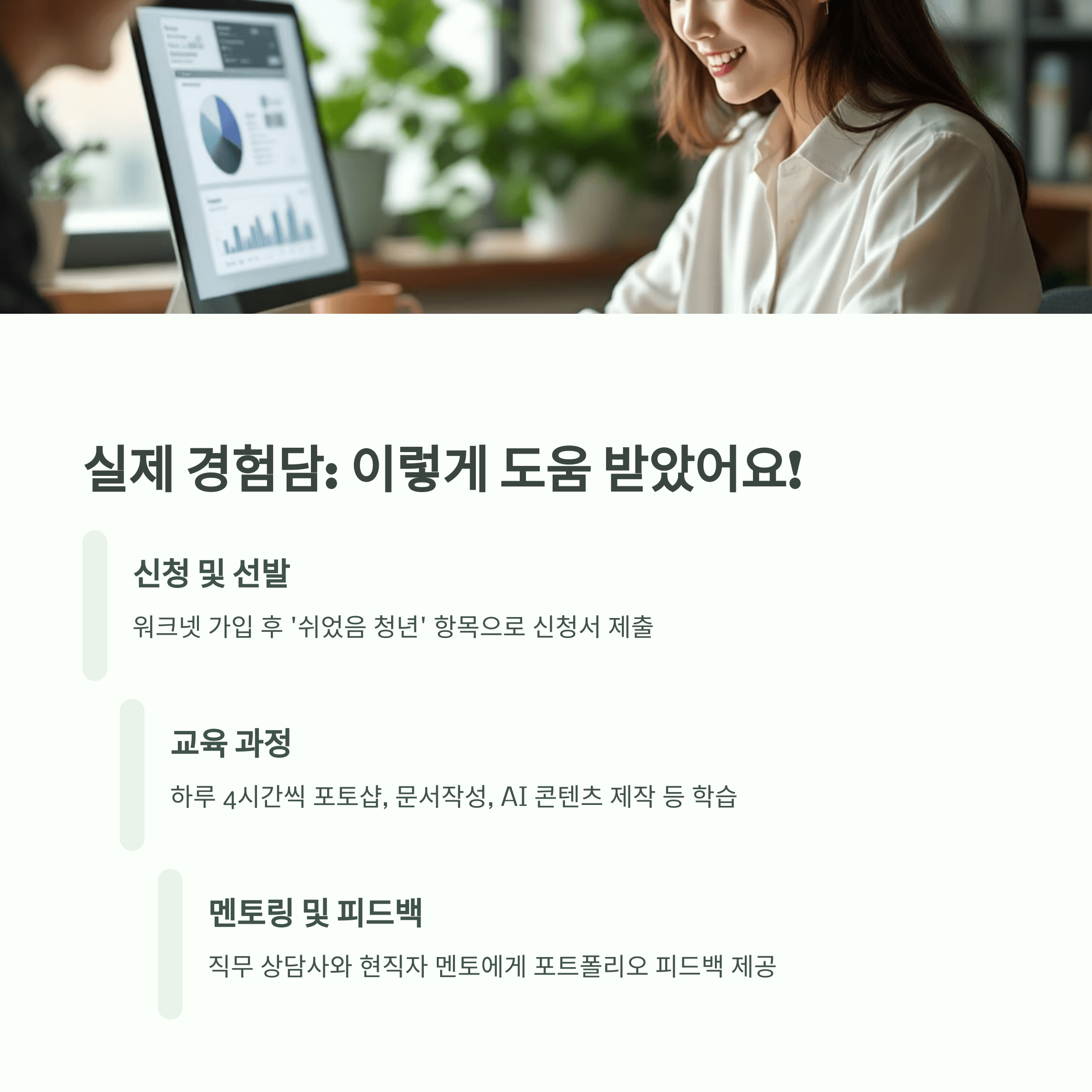 면접과 서류 합격 후 서울역 인근 강의장에서 수업을 들었고, 하루 4시간씩 포토샵·문서작성·AI 기반 콘텐츠 제작 등을 배우며 포트폴리오를 완성했지요.