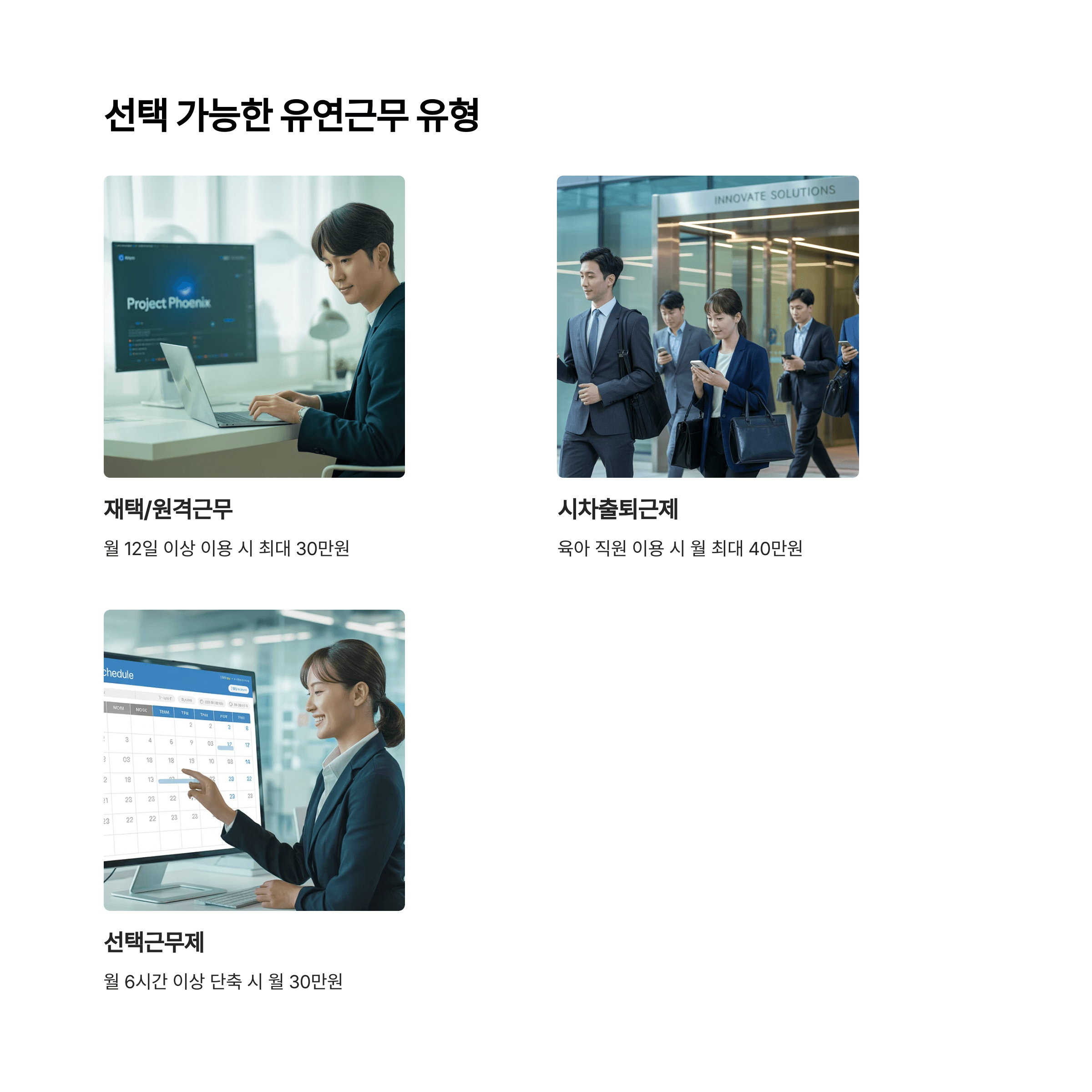 - 선택근무는 월 6시간 이상 단축 시 월 30만 원(연 최대 360만 원)
