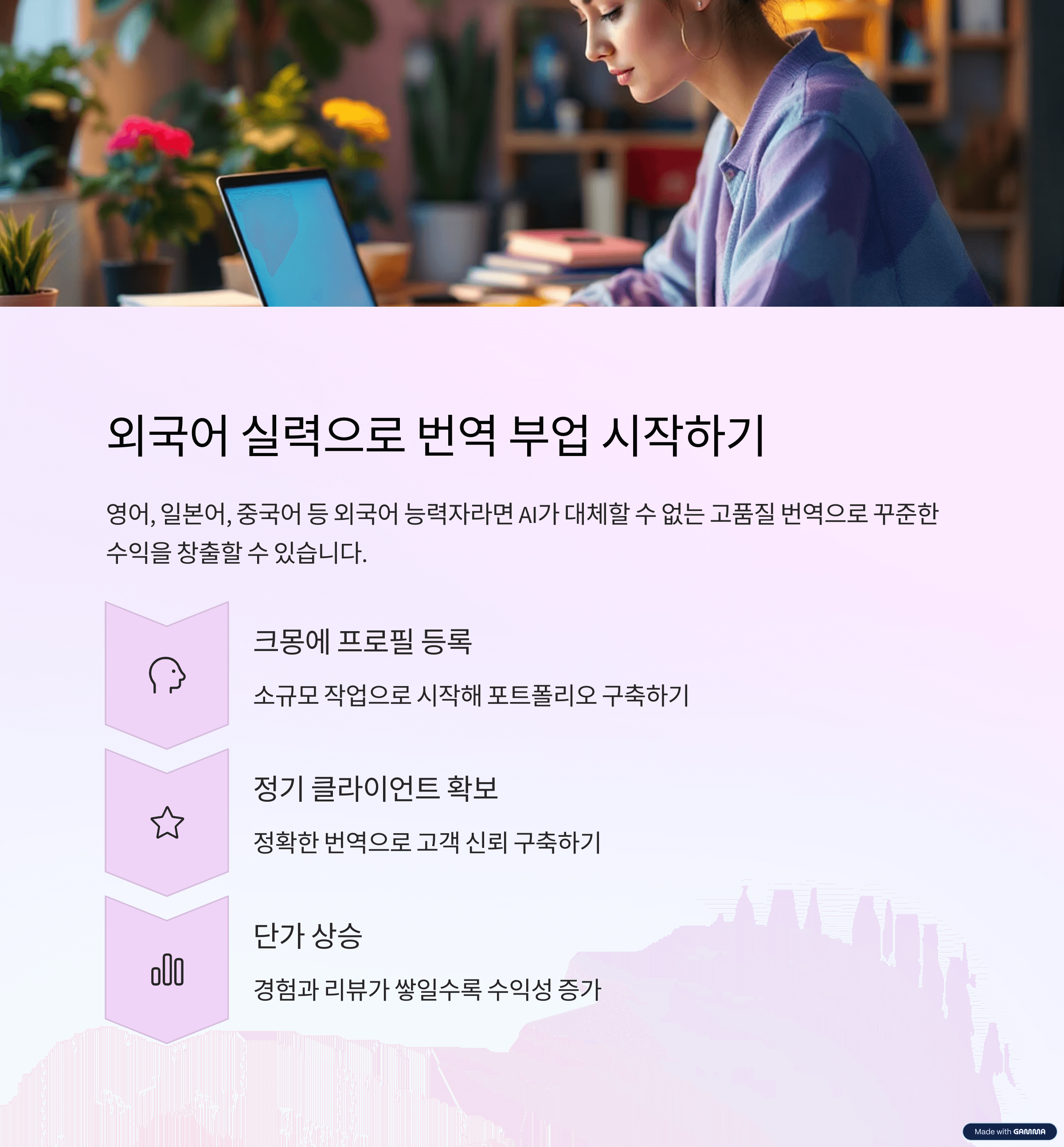 영어나 일본어, 중국어 등 외국어에 능숙하신 분이라면 콘텐츠 번역이나 외주 작업을 추천해 드려요.