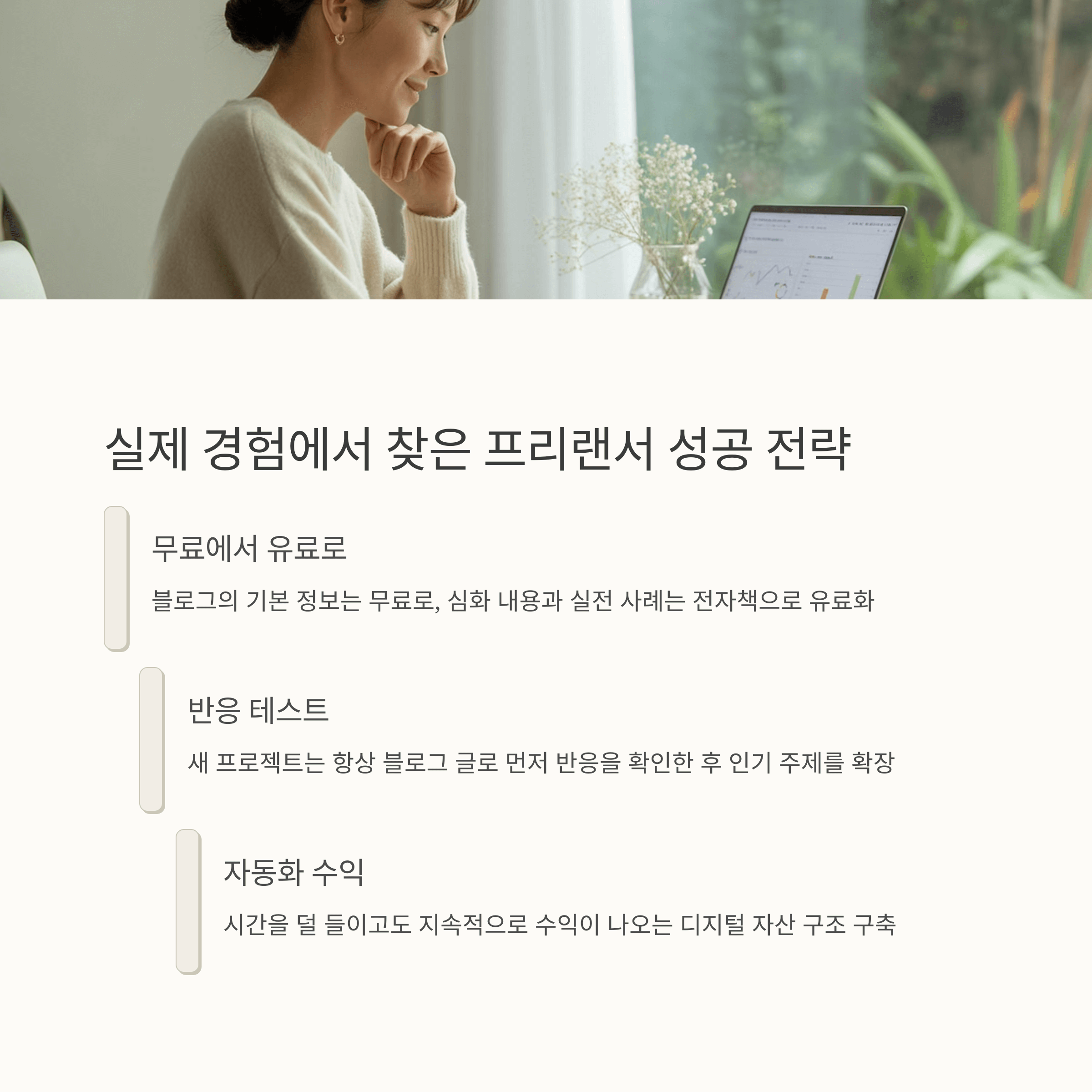 하나의 디지털 자산이 또 다른 수익 루트를 열어주고, 그렇게 연결된 루트가 장기적인 파이프라인을 만들어 주는 거죠. 프리랜서로서 불안하지 않으려면, 단발적인 수익이 아닌 구조적인 수익 모델을 구축하는 것이 핵심입니다.