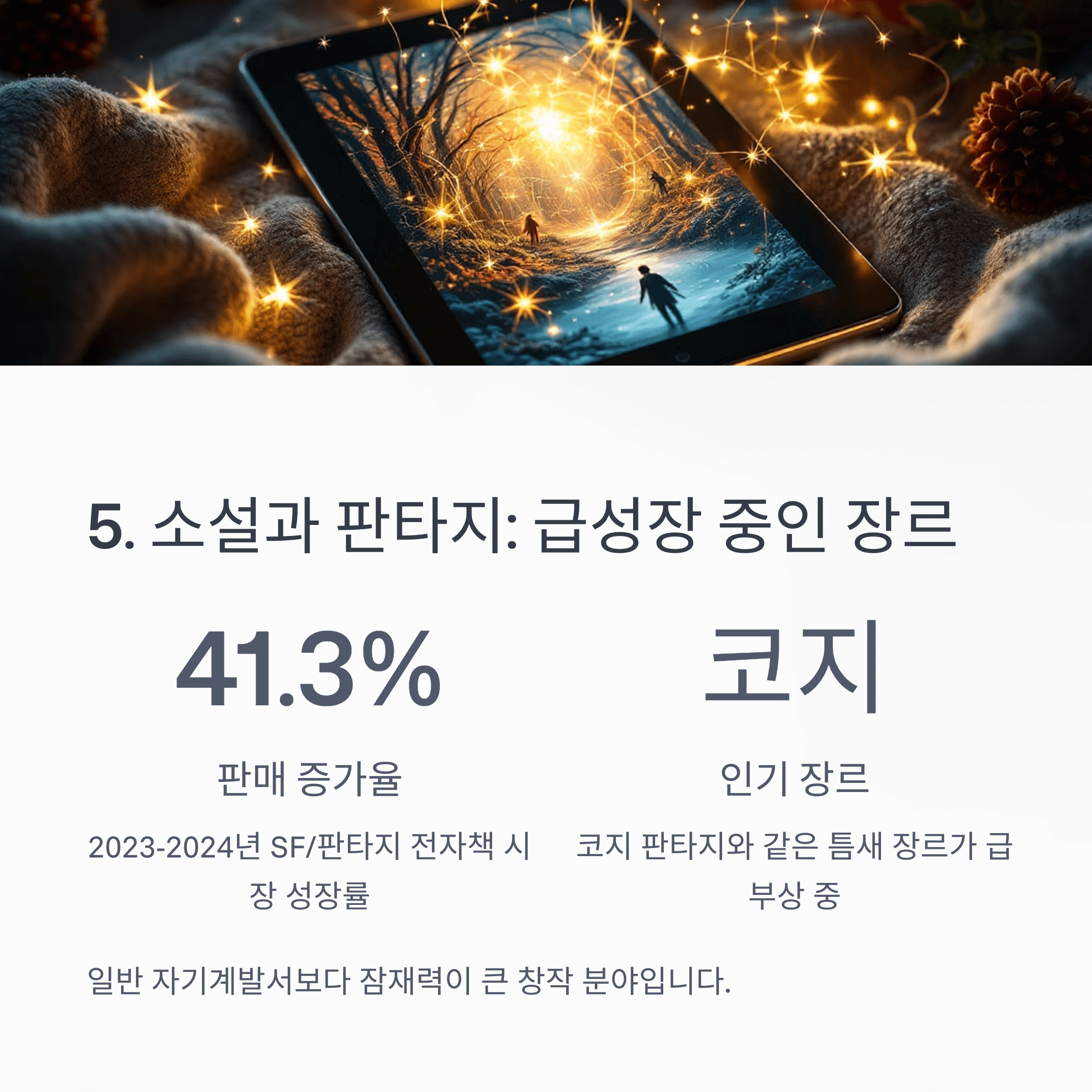 일반 전자책과 달리 소설 장르도 생각보다 수익성이 높은 편이기도 합니다. 특히 코지 판타지같은 틈새 장르가 최근 급부상 중이라고 하네요. 2023년~2024년 사이 SF와 판타지 전자책 판매가 41.3% 증가했다는 보고도 있습니다.