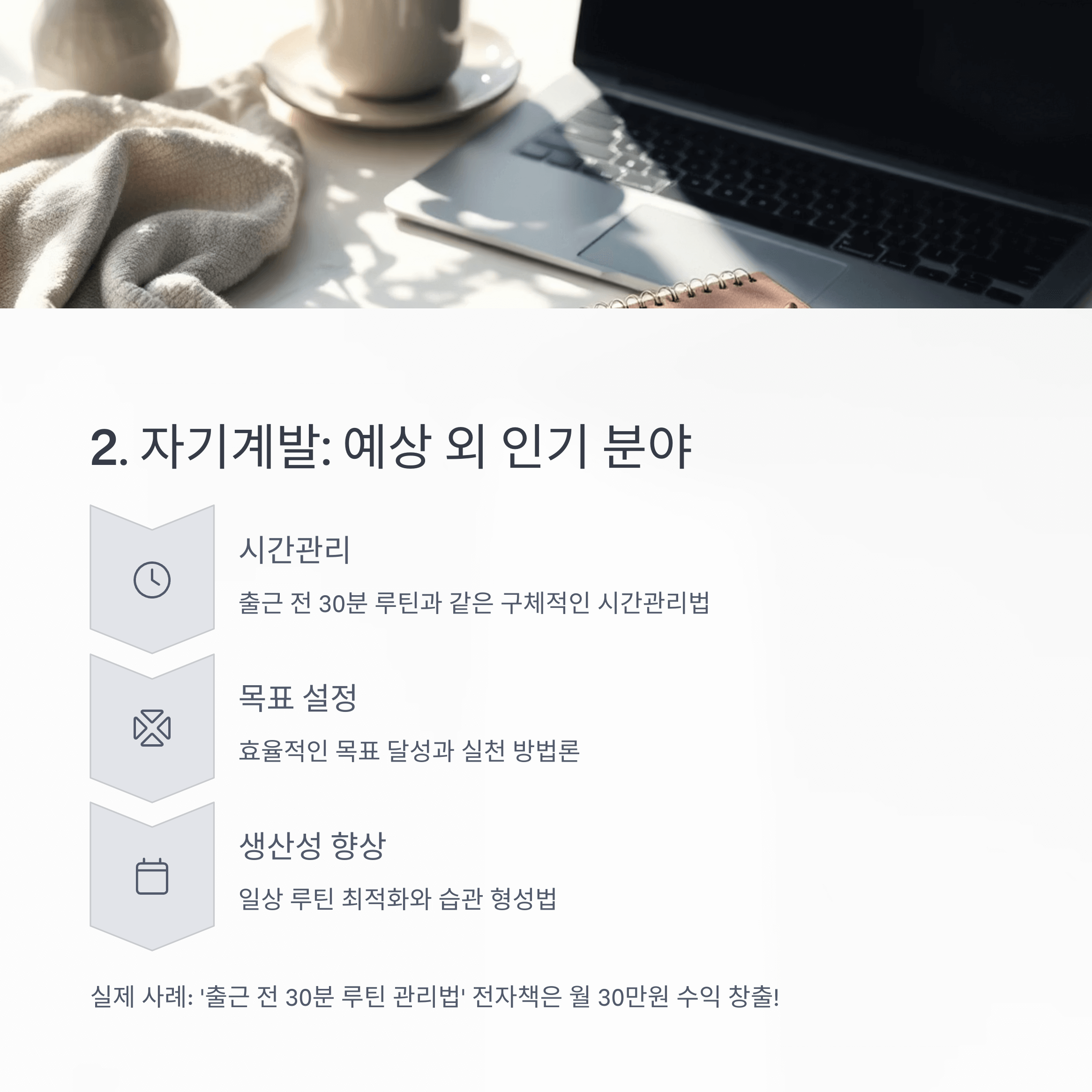 '시간관리, 목표, 효율적인 루틴' 등과 같은 주제로 전자책을 쓰면 꾸준히 수익이 납니다. 이 주제는 누구나 공감하고 필요하죠. 실제로 제 친구가 만든 '출근 전 30분 루틴 관리법'이라는 전자책은 출근이라는 키워드 유입이 많아서인지 한달에 30만원 정도 벌었다고 하더라구요.