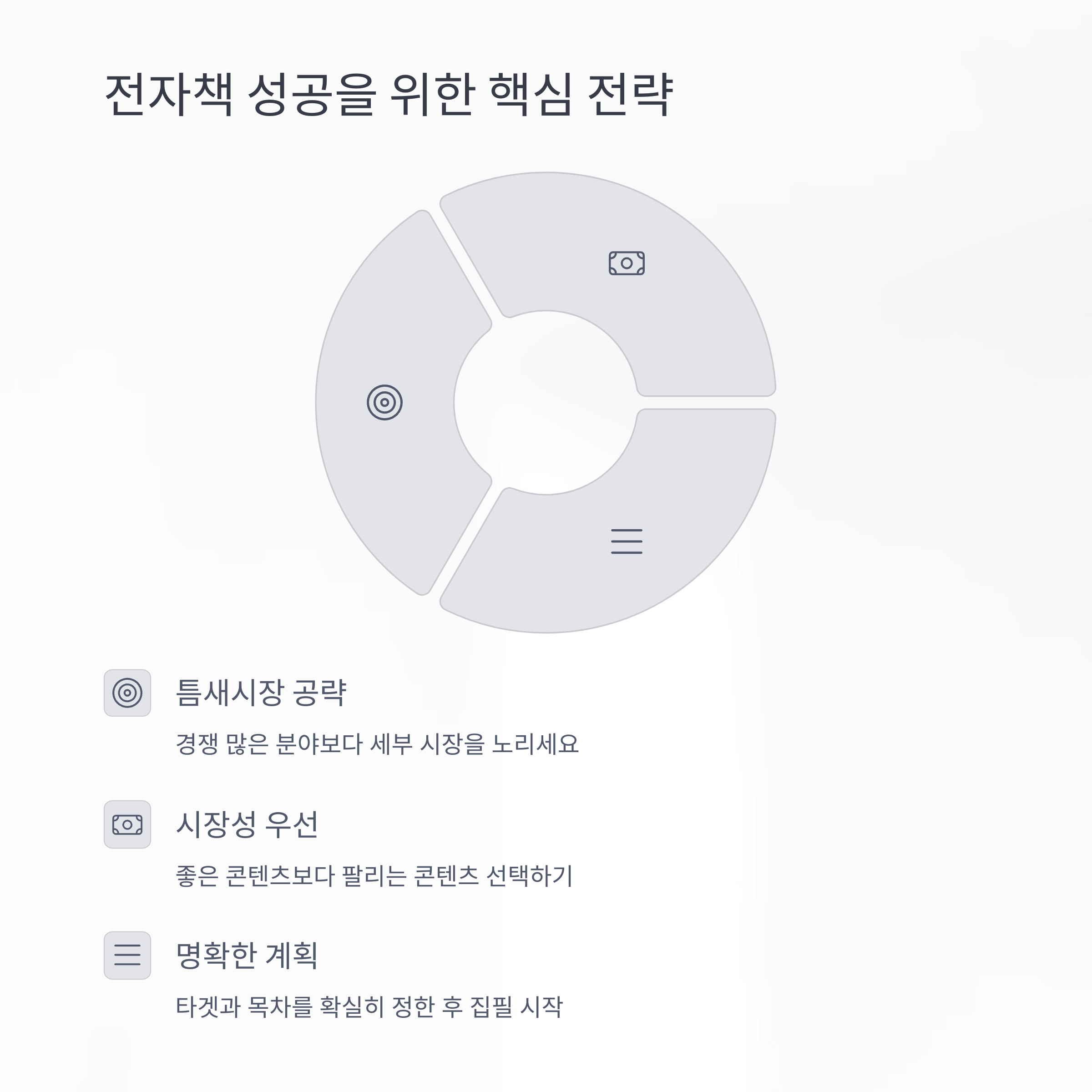 제가 전자책을 제작하며 깨달은 건, 틈새가 중요하다는 것이었어요. 경쟁 많은 곳보다 경쟁은 덜한 세부 시장을 노리는 게 더 효과적이라는 것이죠. 또 좋은 콘텐츠보다 팔리는 콘텐츠를 선택하는 것도 중요한 교훈이었습니다..