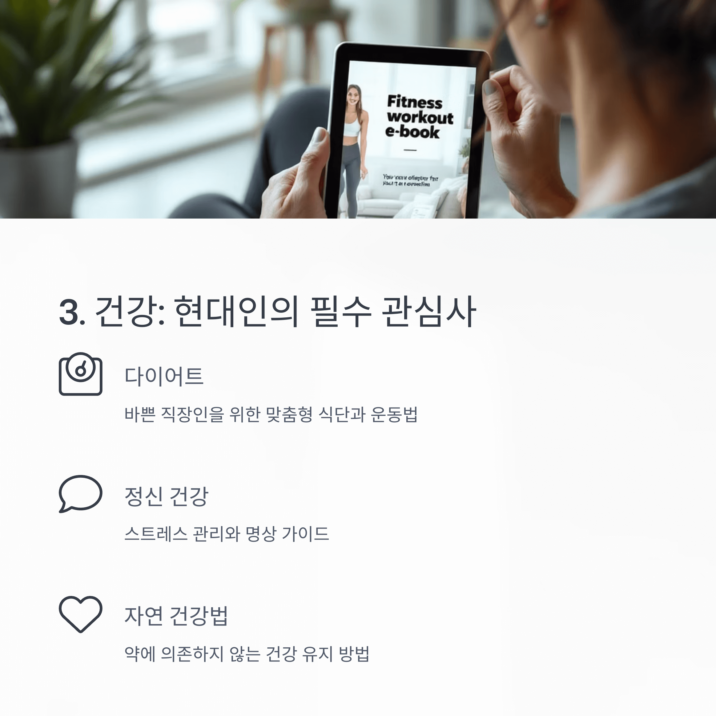 현대인들 사이에서 '다이어트, 홈트레이닝, 명상, 스트레스 관리 등' 건강에 대한 관심은 매일 늘어나고 있습니다. 특히 바쁜 직장인이나 자연 건강법에 관심있는 대상에게 맞춘 전자책은 잘 팔립니다.