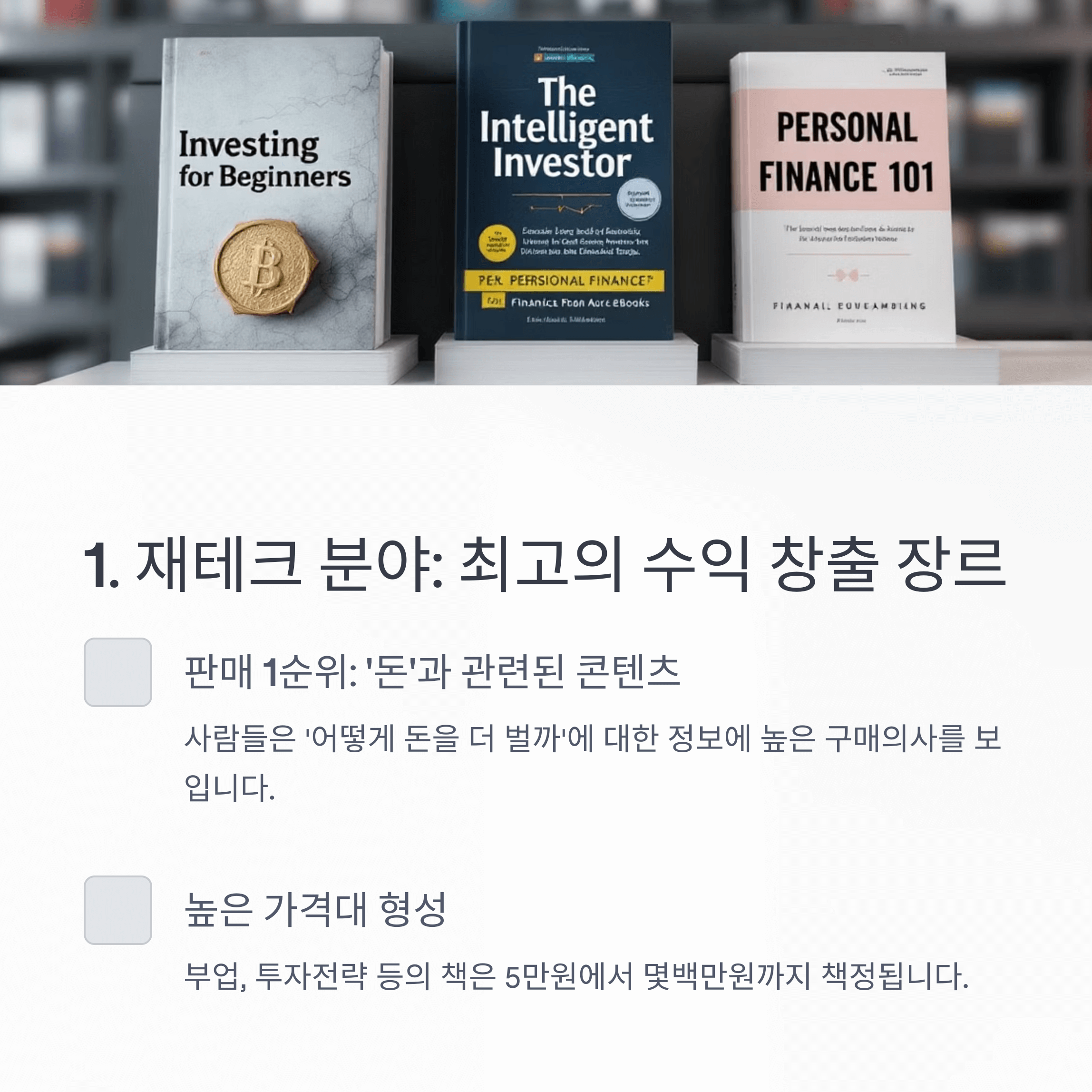 전자책에 관심있으셨던 분들은 전자책을 구매하거나 아님 전자책 판매사이트에 들어가 보시기는 해보셨을 것 같아요. 그 사이트 내에 들어가면 가장 최상단에 올라가 있는 대다수의 책들이 '재테크' '돈' '수익'에 관한 내용이 적힌 책입니다.