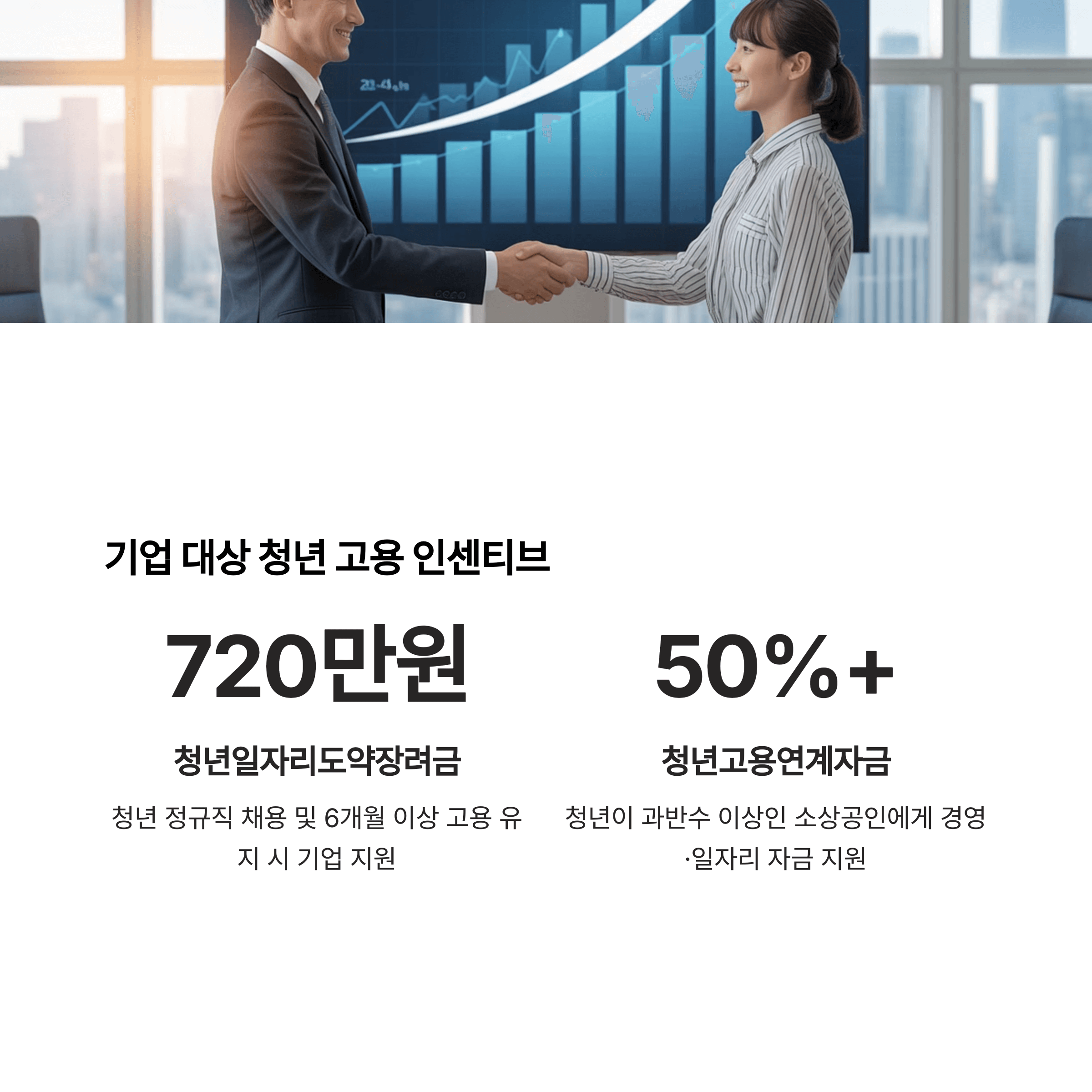 대표적으로 청년일자리도약장려금은 청년을 정규직으로 채용하고 6개월 이상 고용 유지 시 기업에 최대 720만 원을 지원하는 제도입니다.