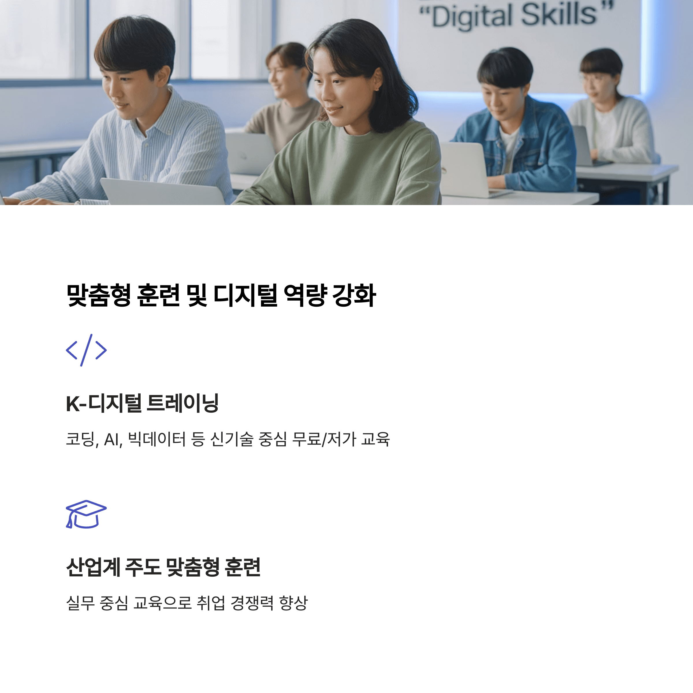 - 디지털·신산업 역량 강화: K-디지털, 산업계 주도 훈련 등으로 취업경쟁력 향상.