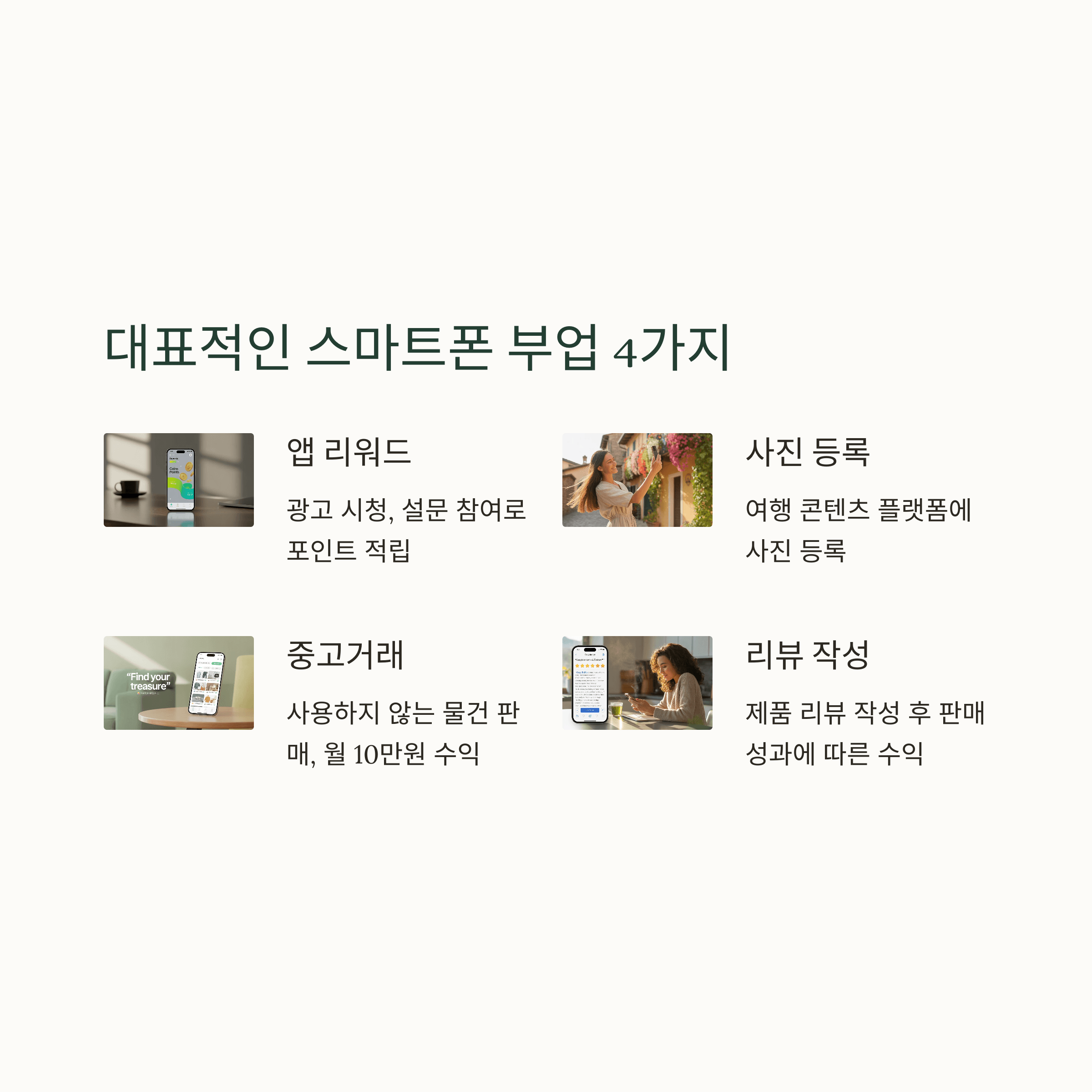 스마트폰 부업은 누구나 쉽게 시작할 수 있고, 꾸준히만 하면 소소하지만 의미 있는 수익이 생깁니다.