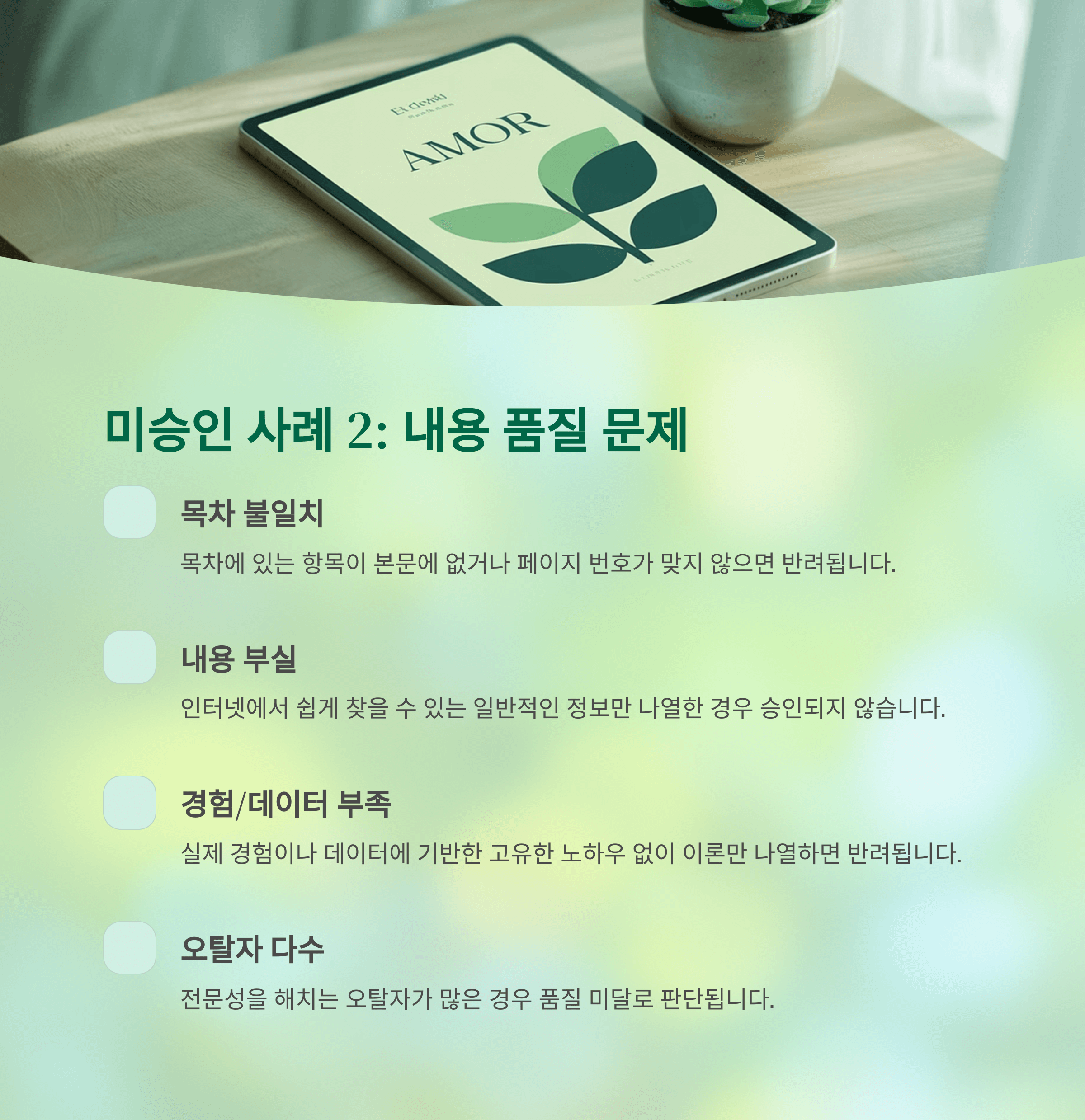 - 구체적인 목차 구성 없이 단락으로만 나누는 경우, 구조 부족으로 판단하여 이 또한 미승인이 날 위험이 있습니다.