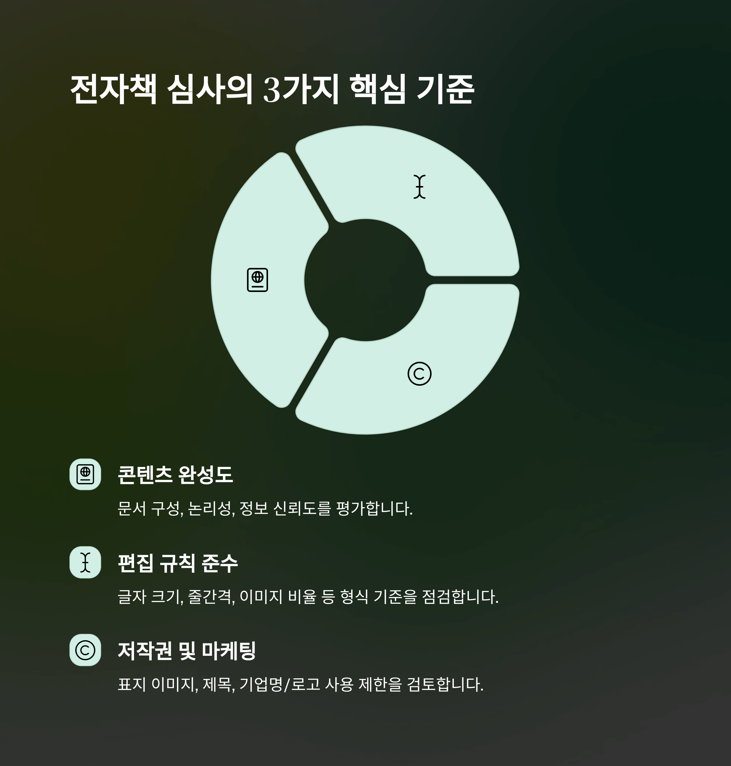 기본 기준을 충족시켜야 하며, 이를 지키지 않는다면 자동으로 반려처리가 되거나 수정 요청을 받게 됩니다. 특히 이미지 중심 전자책은 정보성 콘텐츠로 받아들이기 어렵다고 판단되기 때문에 승인 가능성이 낮습니다.