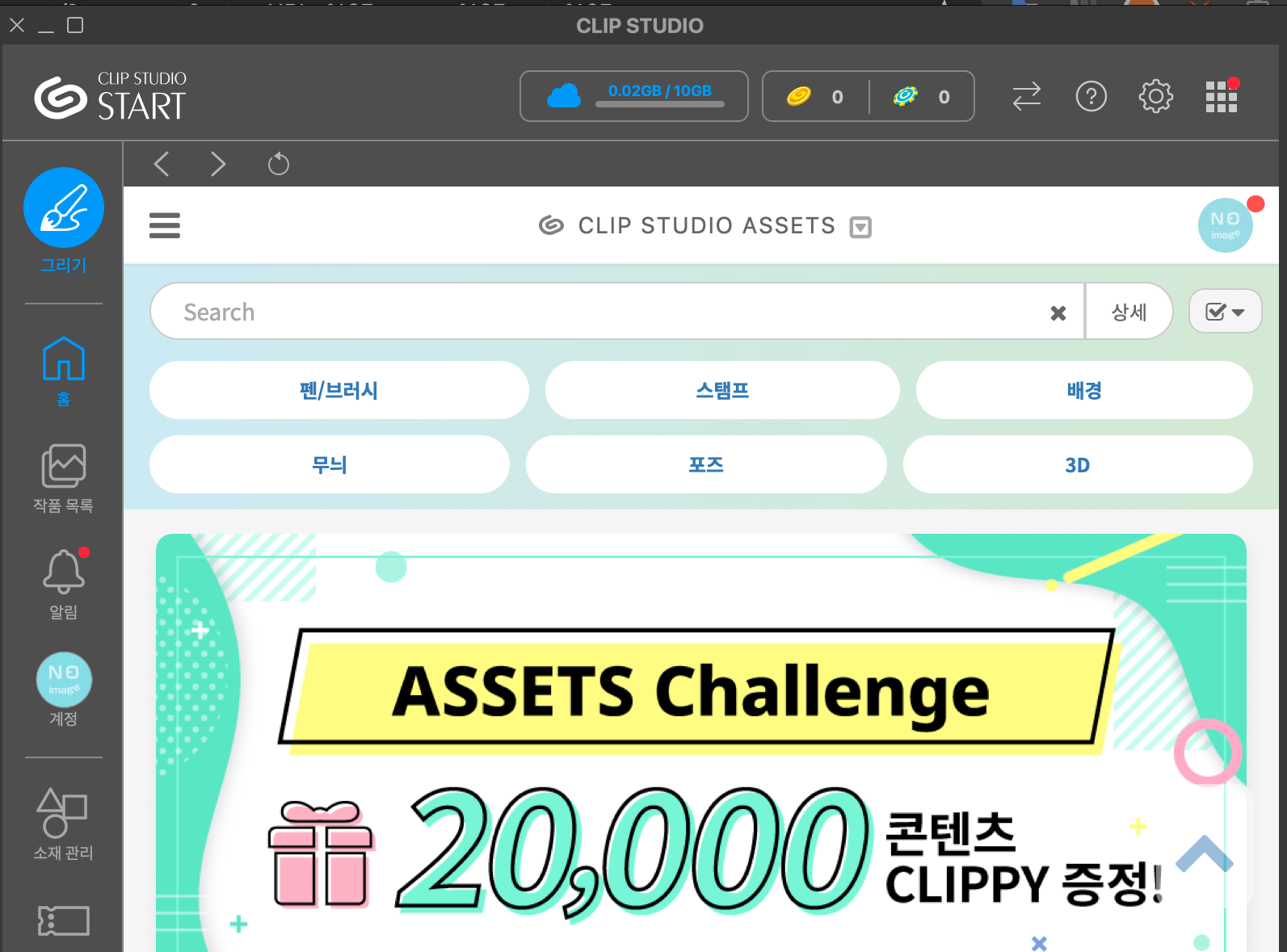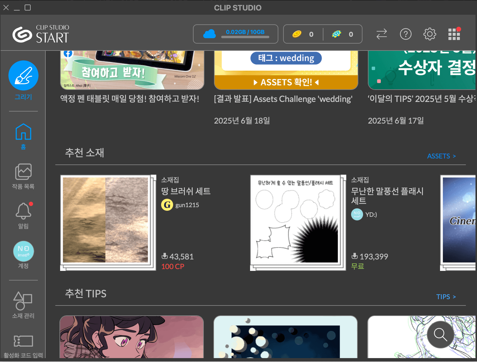그것이 바로 '클립스튜디오 에셋'인데요. 그곳에 들어가면 많은 툴들을 보실 수 있을 거예요.