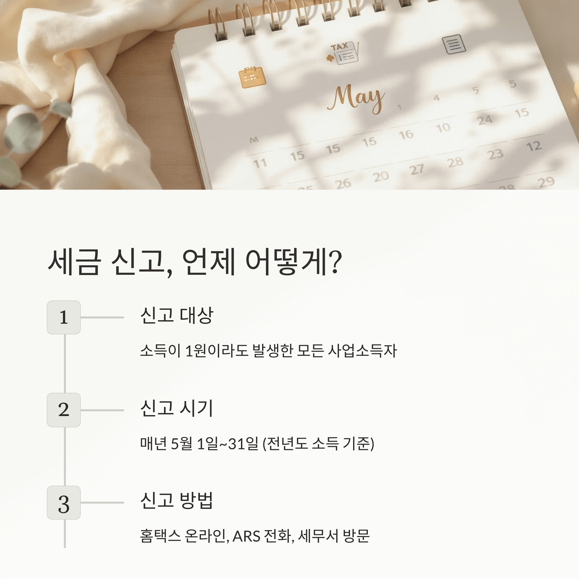 전년도 소득 기준으로, '종합소득세의 달'인 5월에 신고해야 합니다. (매년 5월 1일~ 5월31일)