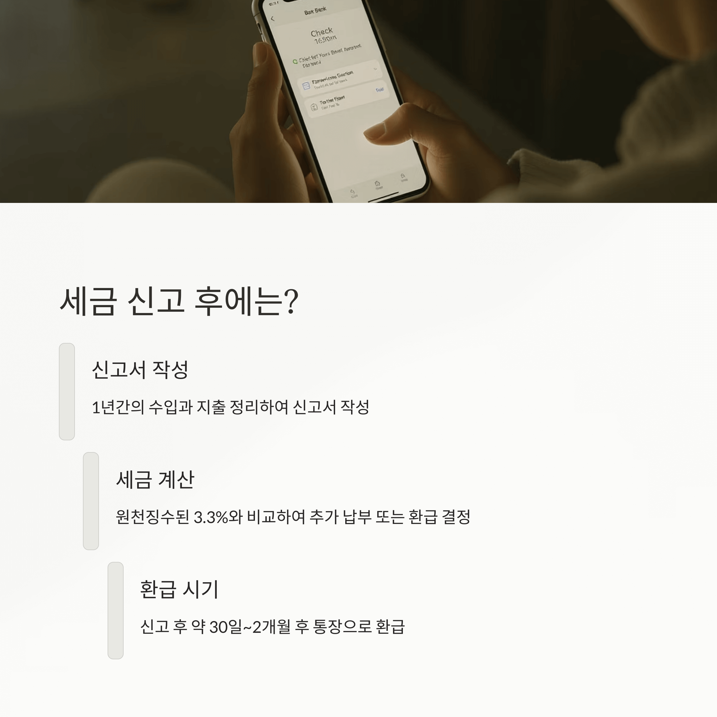 1년 동안 번 돈과 쓴 돈을 잘 정리해서 신고서를 작성합니다. 소득 중에 이미 원천징수된 3.3퍼센트와 비교해서 더 내야 한다면, 추가 납부하고 적게 냈으면 환급할 수 있습니다. 그리고 이건 국세청에서 '더 낼 세금이 있는지 돌려줄 돈이 있는지' 계산해서 연락 주니 걱정하지 않으셔도 됩니다.