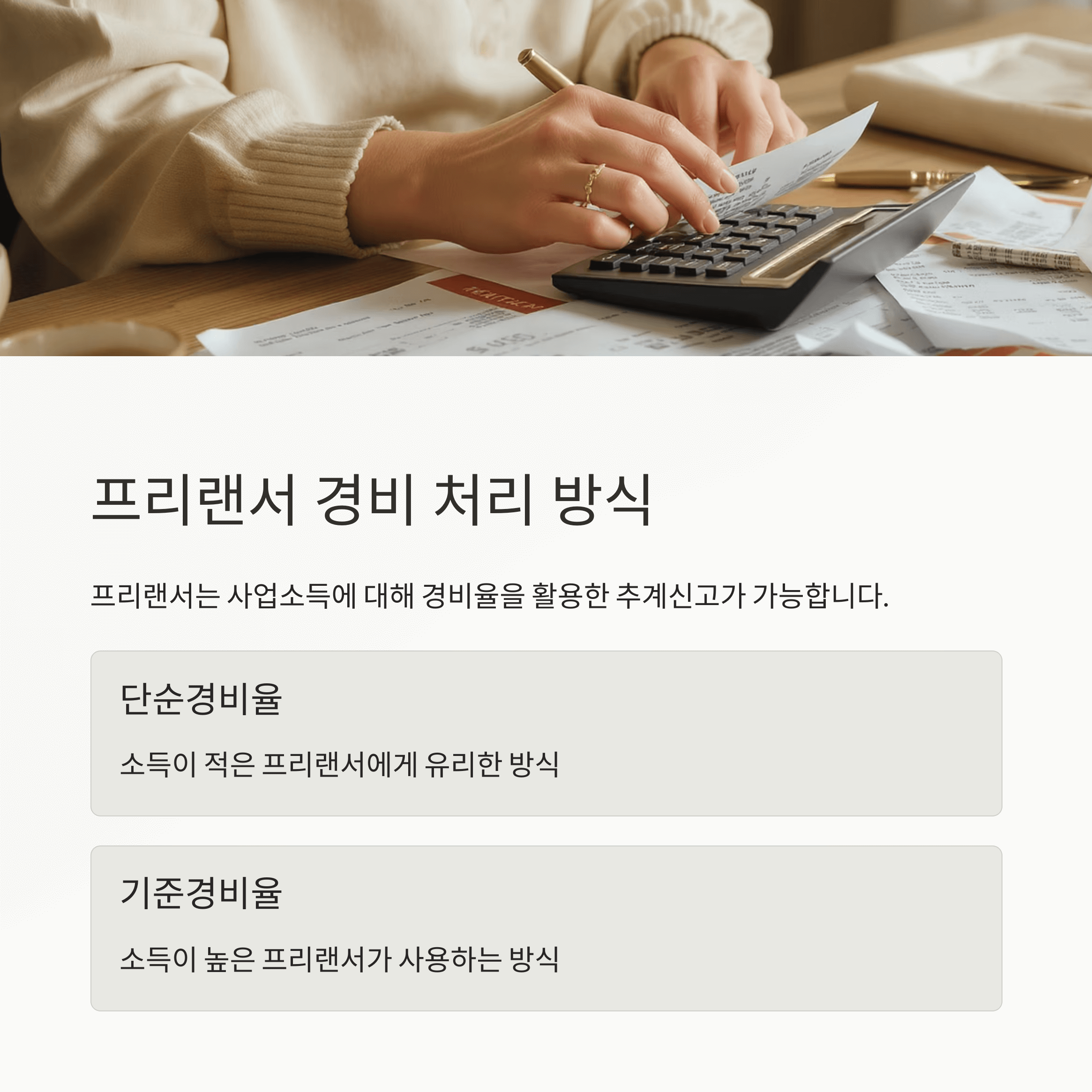 3. 경비 방식은 '단순경비율'과 '기준경비율'이 있지만, 보통 프리랜서는 단순경비율을 많이 합니다.