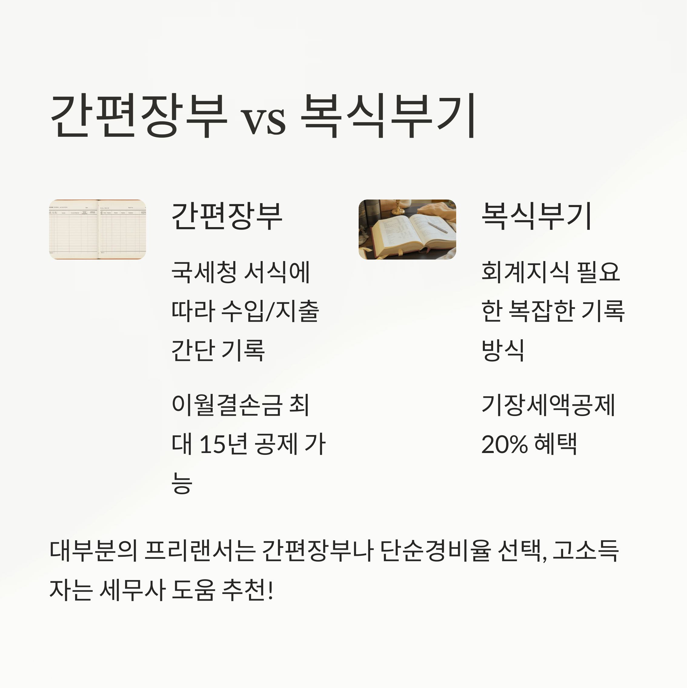 복식부기는 기업처럼 자산 자본 등 복잡하게 기록해야 해서 회계지식이 필요하고 관리부담이 커요. 이럴 땐 세무사 필수죠.프리랜서는 소득과 경비만 단순하게 관리하는 경우가 대다수라 보통 간편 장부 또는 단순 경비율을 선택해서 신고합니다.