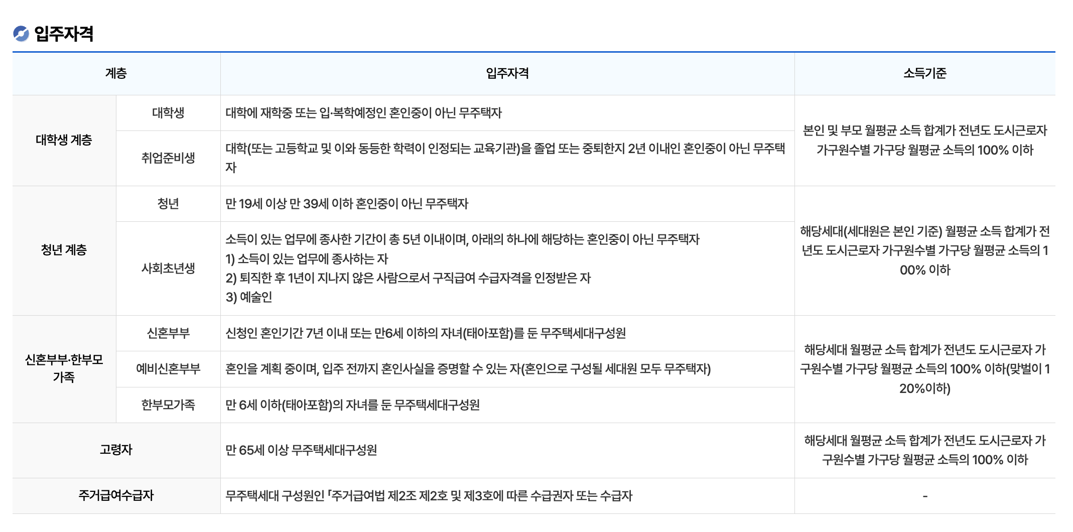 - 주거급여수급자, 산업단지 근로자 등 특수계층도 자격 인정됨