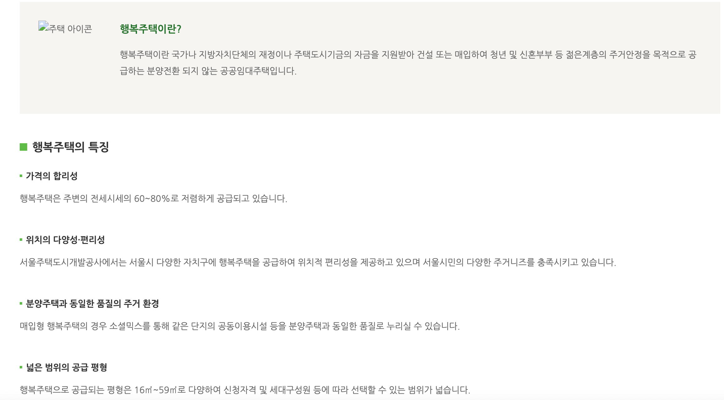 - 행복주택은 청년·신혼부부 등을 위해 시세보다 저렴하게 공급되는 공공임대주택으로, 주거비 부담을 줄이는 데 도움을 줍니다.