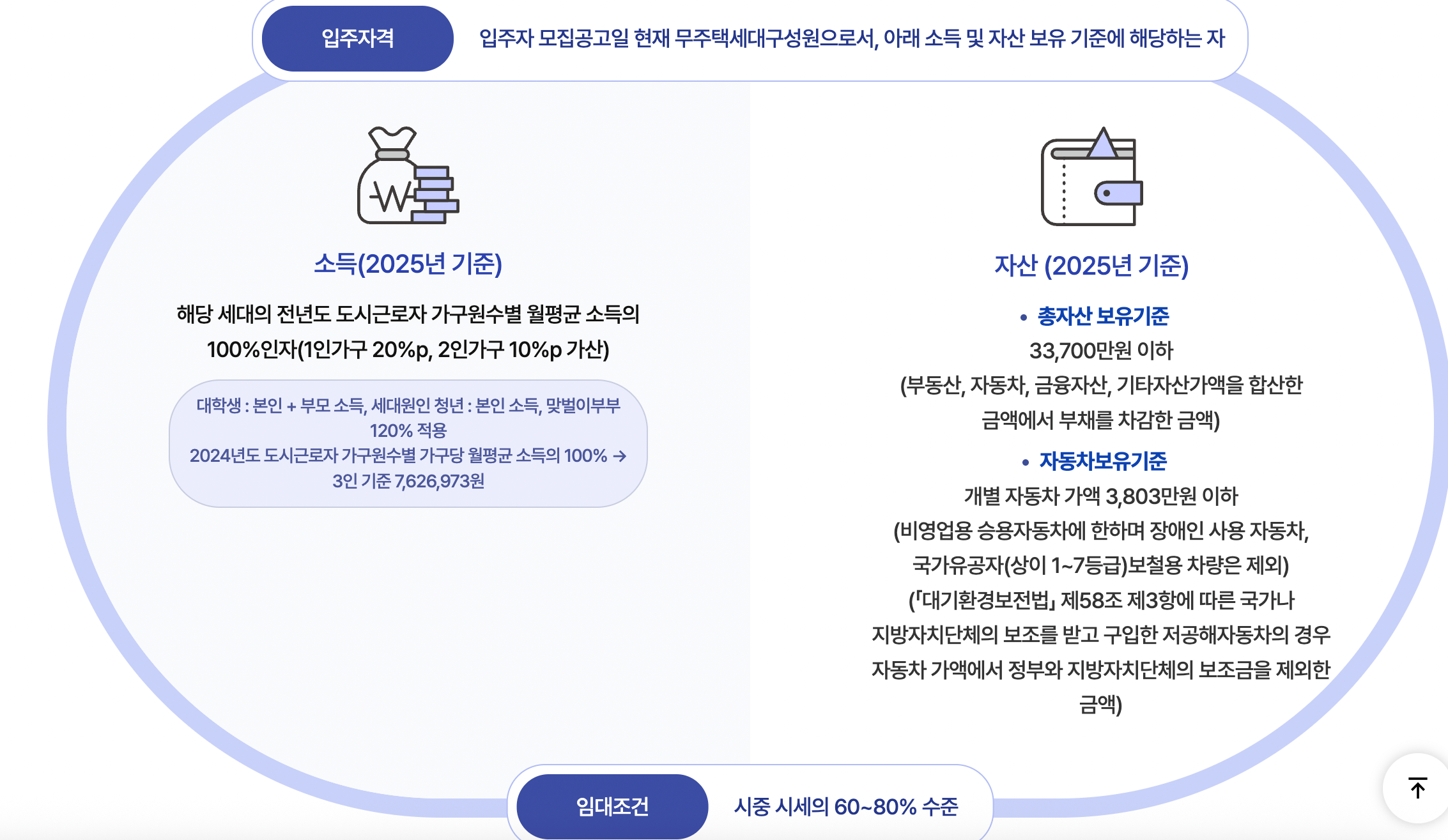 - 대학생·취업준비생: 대학 재학 또는 입·복학 예정자, 만 6세 이하 자녀 없이 무주택자. 본인+부모 월평균소득 합산 100% 이하.