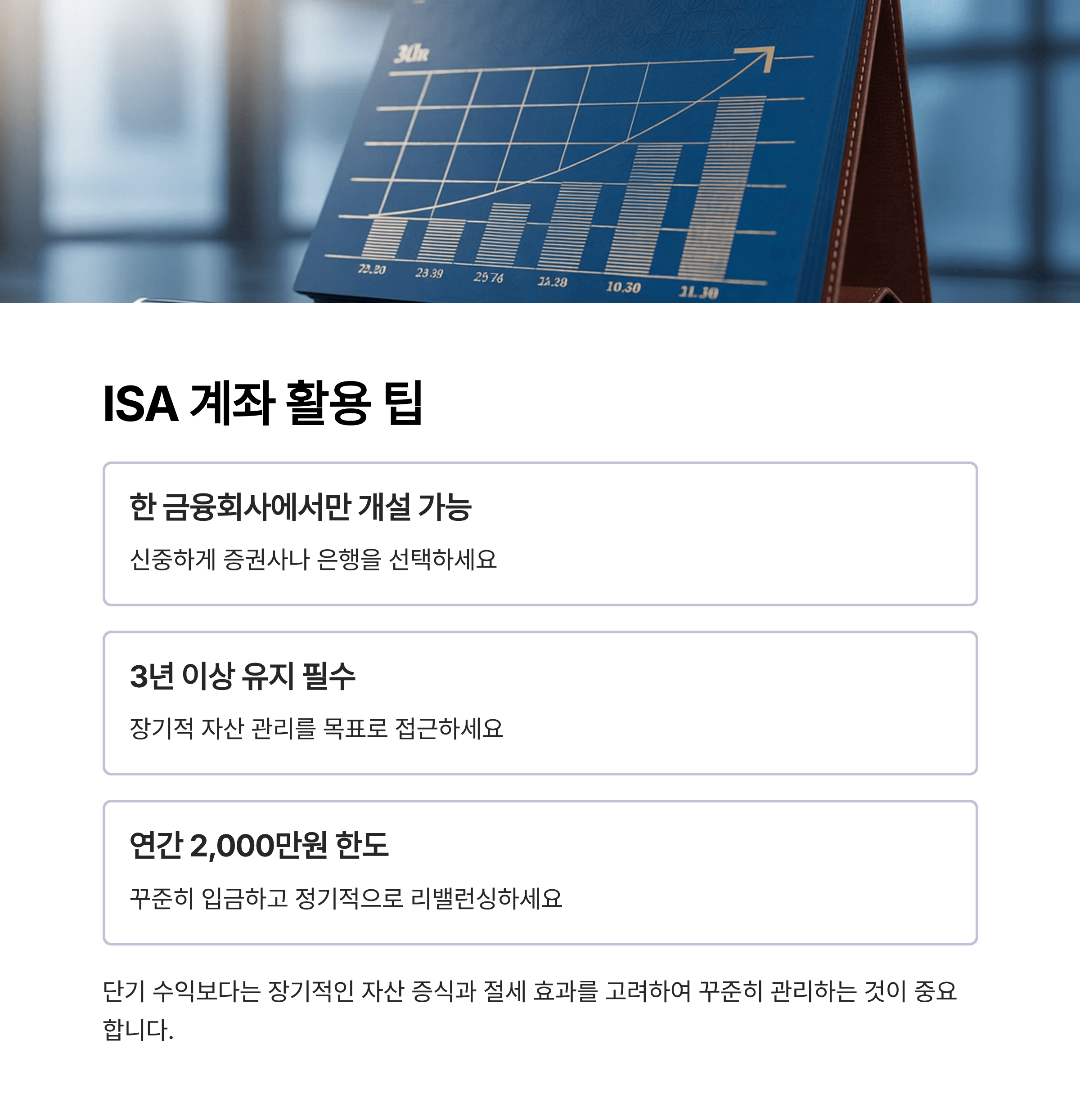 또한 ISA 계좌는 가입 기간을 3년 이상 유지해야 세금 혜택이 적용되므로, 단기 수익을 목적으로 하기보다는 장기적 자산 관리를 목표로 접근해야 해요. 매년 2,000만 원 한도로 투자할 수 있으니, 꾸준히 입금하고 자산 배분을 리밸런싱해주는 것이 중요합니다.